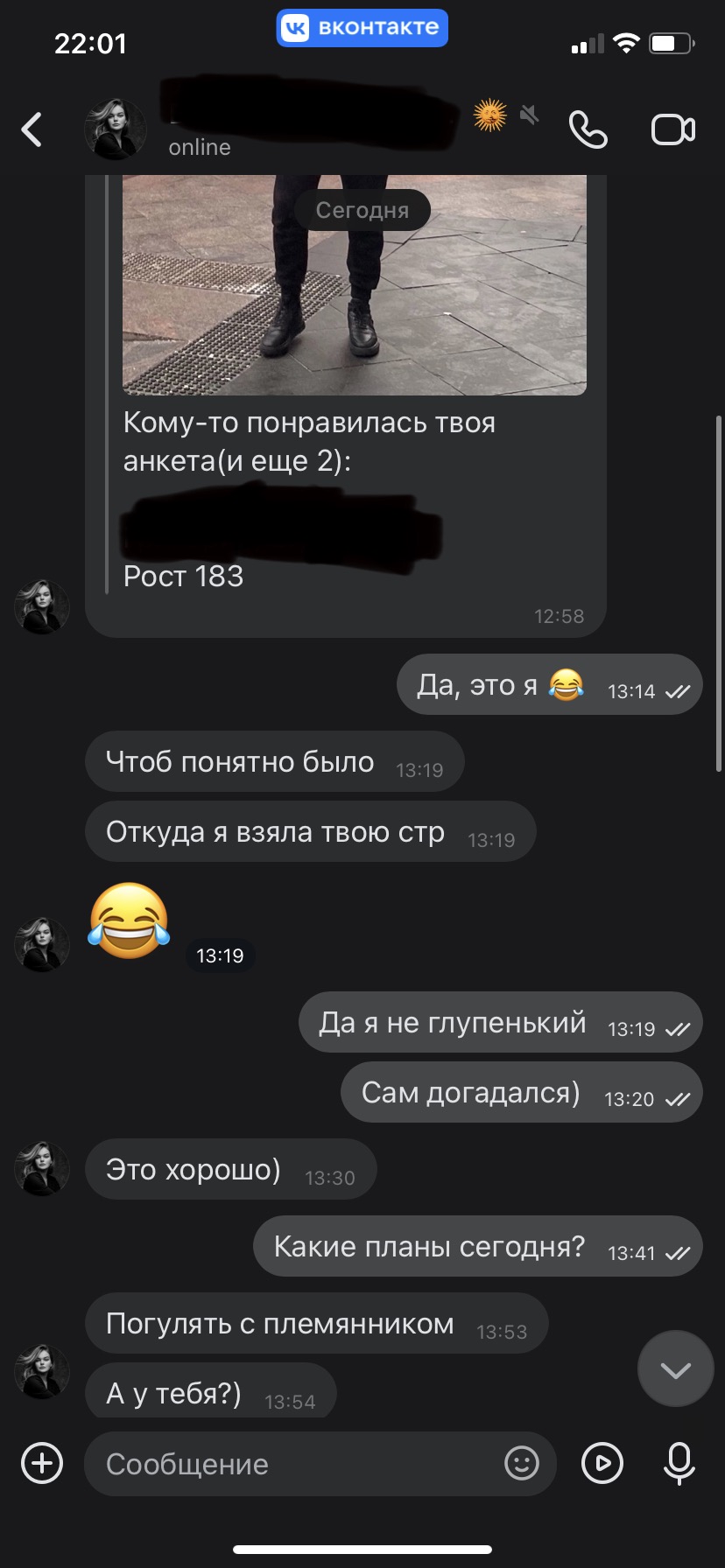 Попробовал писать девкам в ВК. Мой товарищ так нашел долгосрочные отношения. Результат за девять «диалогов»: 1 - неверный город (типа) 1 - начала игнорить после ответа на вопрос «Ты кто?» 1 - я сам начал игнорить после вопроса «Ты кто?» 6 - не знакомятся либо заняты (верим) Я искал профили, где нет фоток с парнями У меня в профиле фотки нет. Занятно, что они изучают профиль (а вдруг чедик)
