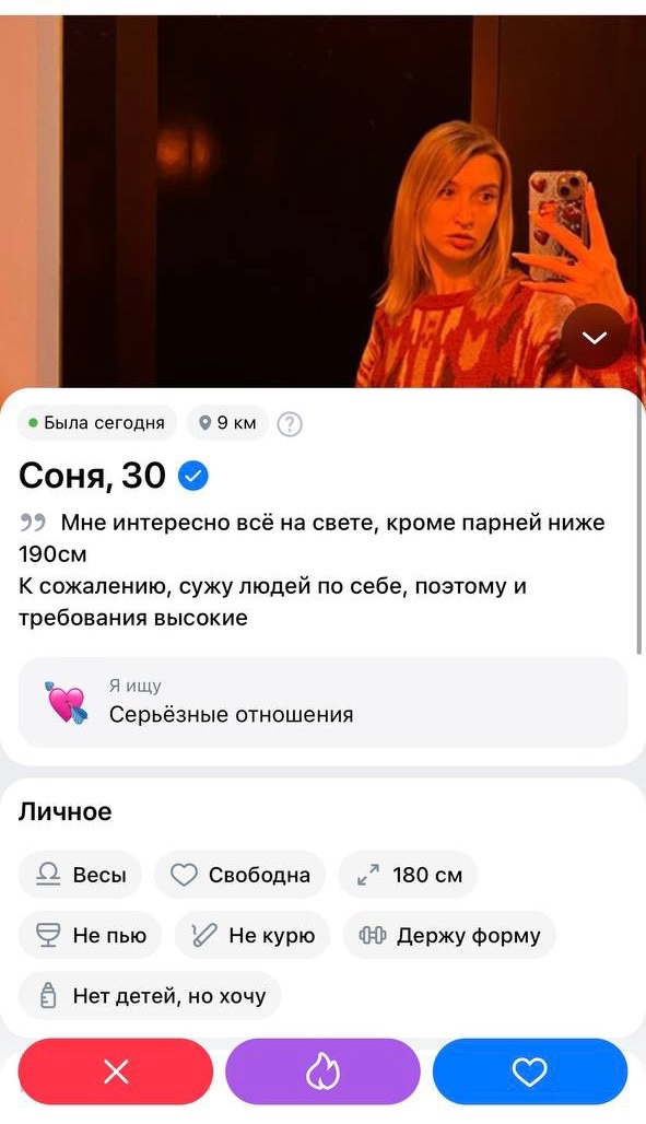 То есть, ее надо полагать оскорбило, что чел ниже нее ростом посмел ее лайкнуть (в ее анкете не сказано про рост парня) и она не просто блокнула но еще и нажаловалась.