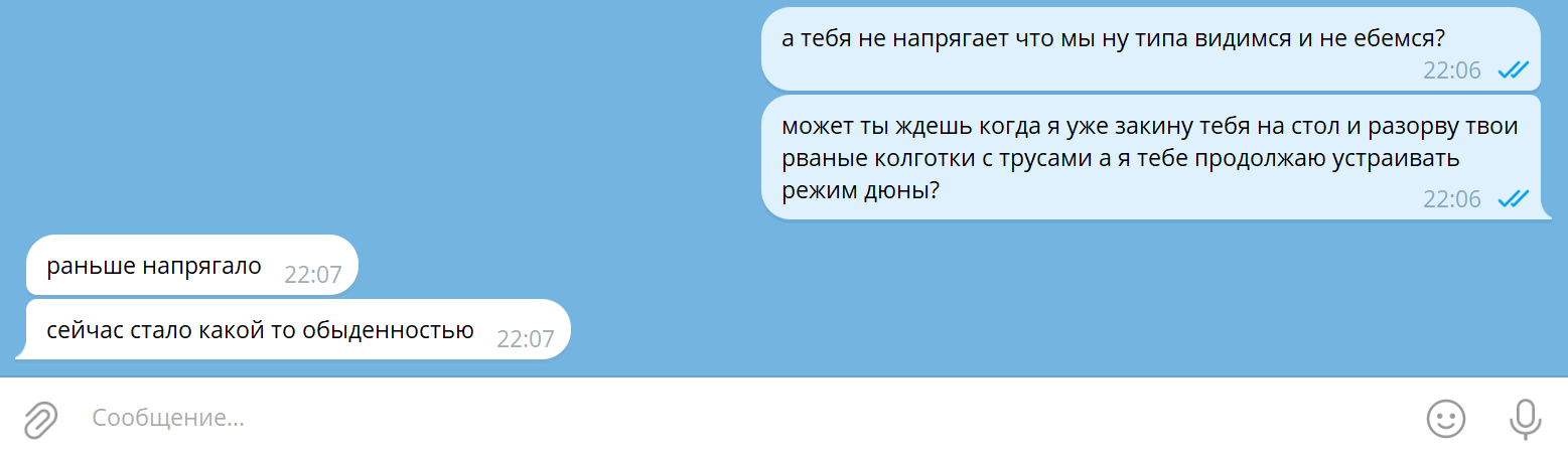 Всё равно что я сейчас ей напишу - отопление так и не включили, холодно. К чему мне вообще например ей это писать, я че придурок что ли. Нормальный человек напишет как ты/я уже скучаю по тебе/и так далее. А не инфу какую-то пустую бесмысленную непонятно к чему. Я типа вот вообще не понимаю а на хуя она в принципе пишет. И я догадываюсь почему. Потому что думает что жилеточка ее сейчас поддержит, утешит, успокоит. Тупо мою энергию тянет. Больше не выйдет.