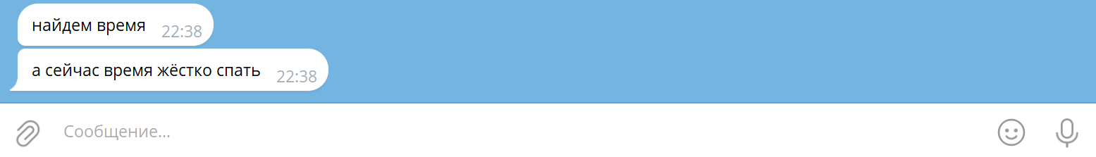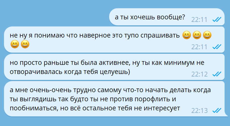 Вчера она написала мне после того как я уехал, часа через 2 где-то - "ты где", я ответил "дома", она скинула стикер с грустным котом и написала "Доброй ночи". Я овтетил "спокойной ночи". Дальше она скинула кружок где оттирает ссаку кошачью от дивана так как кошка снова нагадила на диван. Мы кратко обсудили ситуацию с кошкой, за тем она написала "голова болит пипец" я ответил что у нее это из-за вейпа с никотином который она ебошит как паровоз сейчас, что у меня от него башка болела до утра когда я попыжал его с ней в предыдущую встречу. Она это не читала, хотя заходила в сеть и через 10 и через 20 и через 30 минут. Потом видимо уснула. Утром вот написал мне то что на скрине. ВСё. Я прочитал и не отвечаю ей. Я не ебу что ей овтечать)