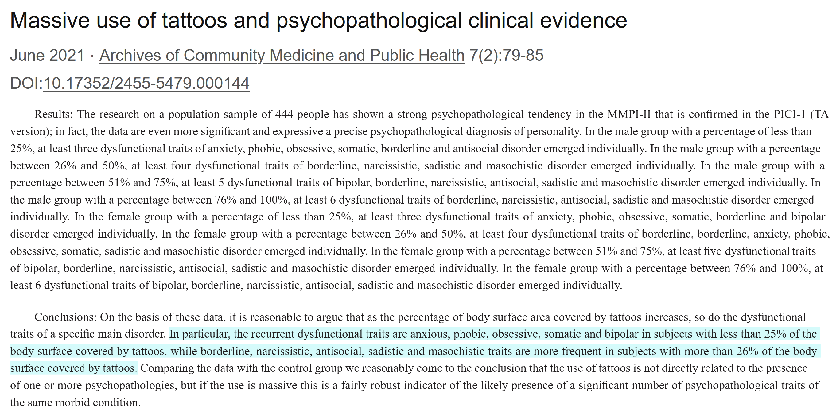 >>10424661 >>10425382 Людей с расстройствами головы я видел и с татухами, и без. Как и здоровых. Какая-то связь и ВЕРОЯТНОСТЬ "тату = траблы с башкой" может прослеживаться, но не более того. Если, конечно не брать совсем крайние случаи, когда человек забит на 146%, включая ебало, подмыхи и обратную сторону коленей - тут явно свистящая кукуха. Как говорится, любая татуировка на лице, вне зависимости от рисунка и текста - это надпись капсболдом "Я - ДОЛБОЁБ"