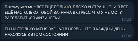 Говоря про мою бывшую ебанашку — самый пиздатый период отношача был когда она работала медсестрой в красной зоне ковида. Приходила домой уставшая, а на выходных ей никакие левые тусовки были не нужны, потому что перед работой ей хотелось отдыхать и проводить время со мной И в целом в тот период она была прям максимально готова к семье. Зато когда ковид кончился она начала сидеть дома и понеслась пизда по кочкам