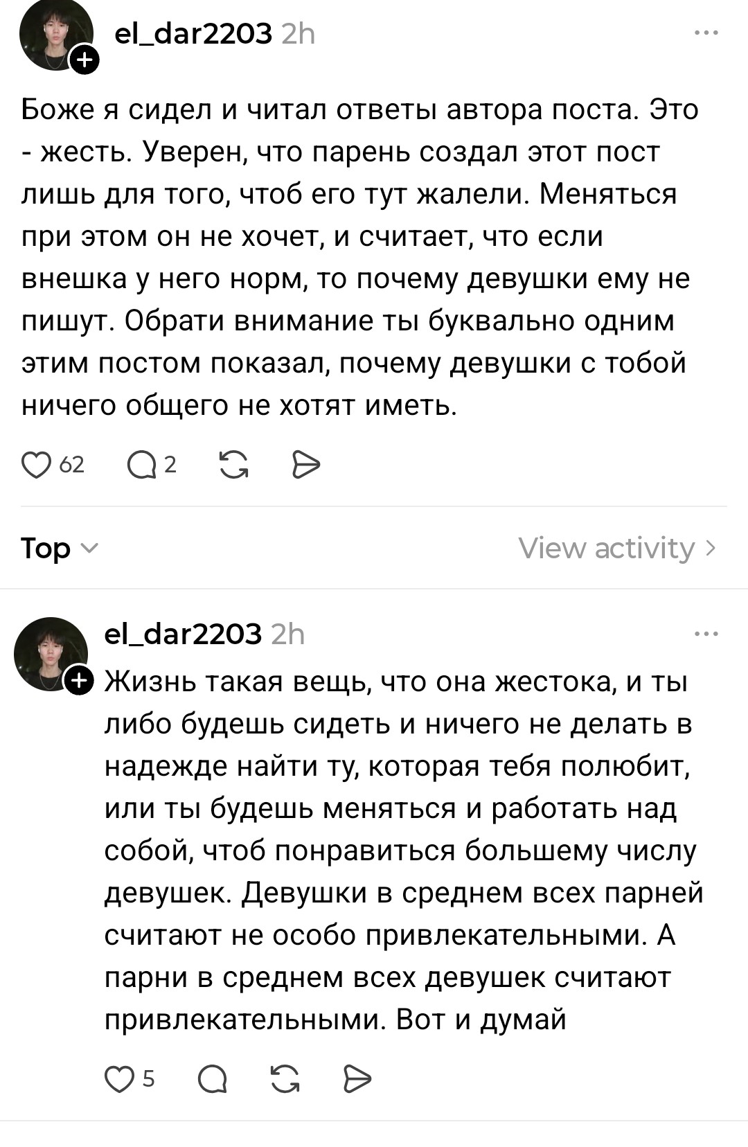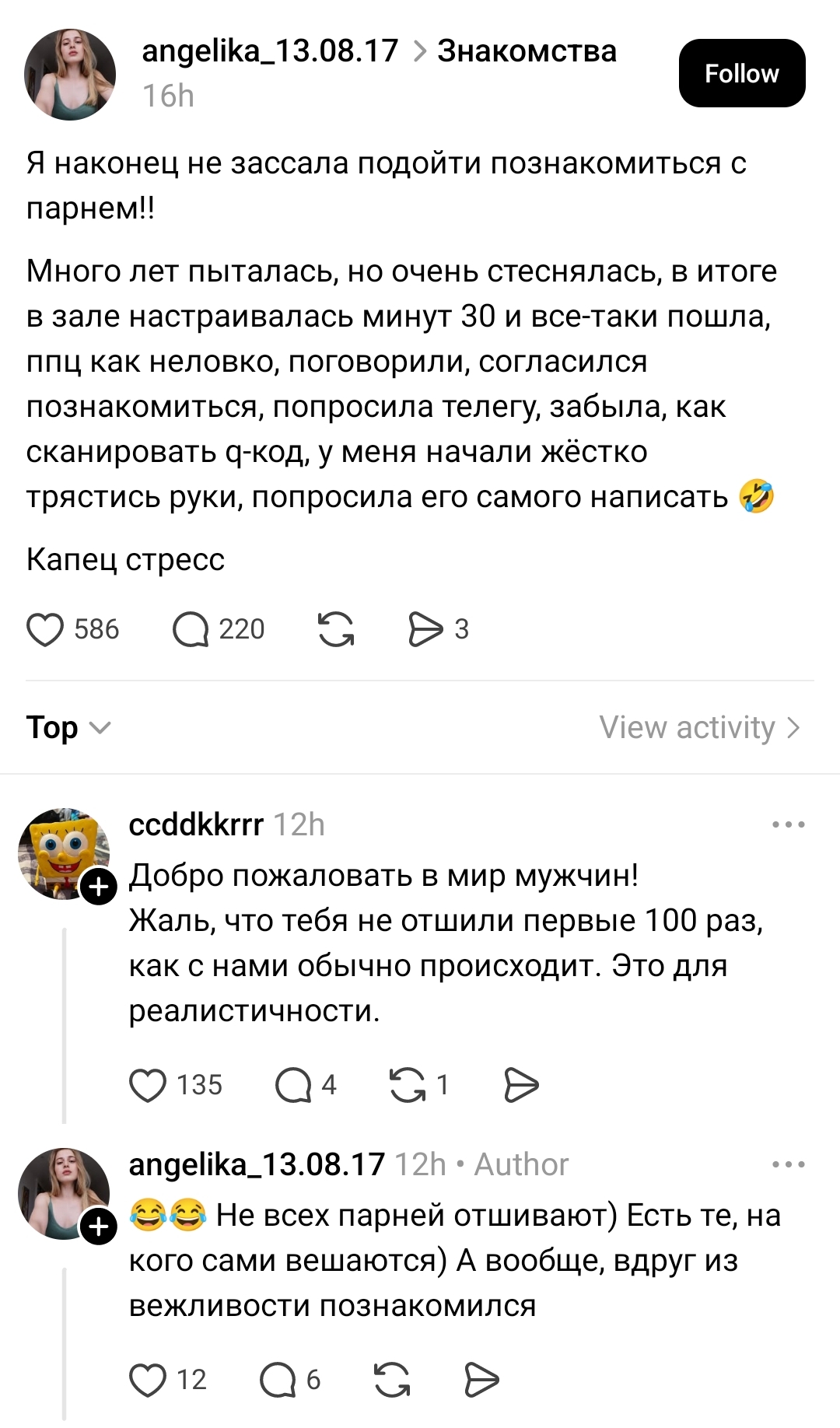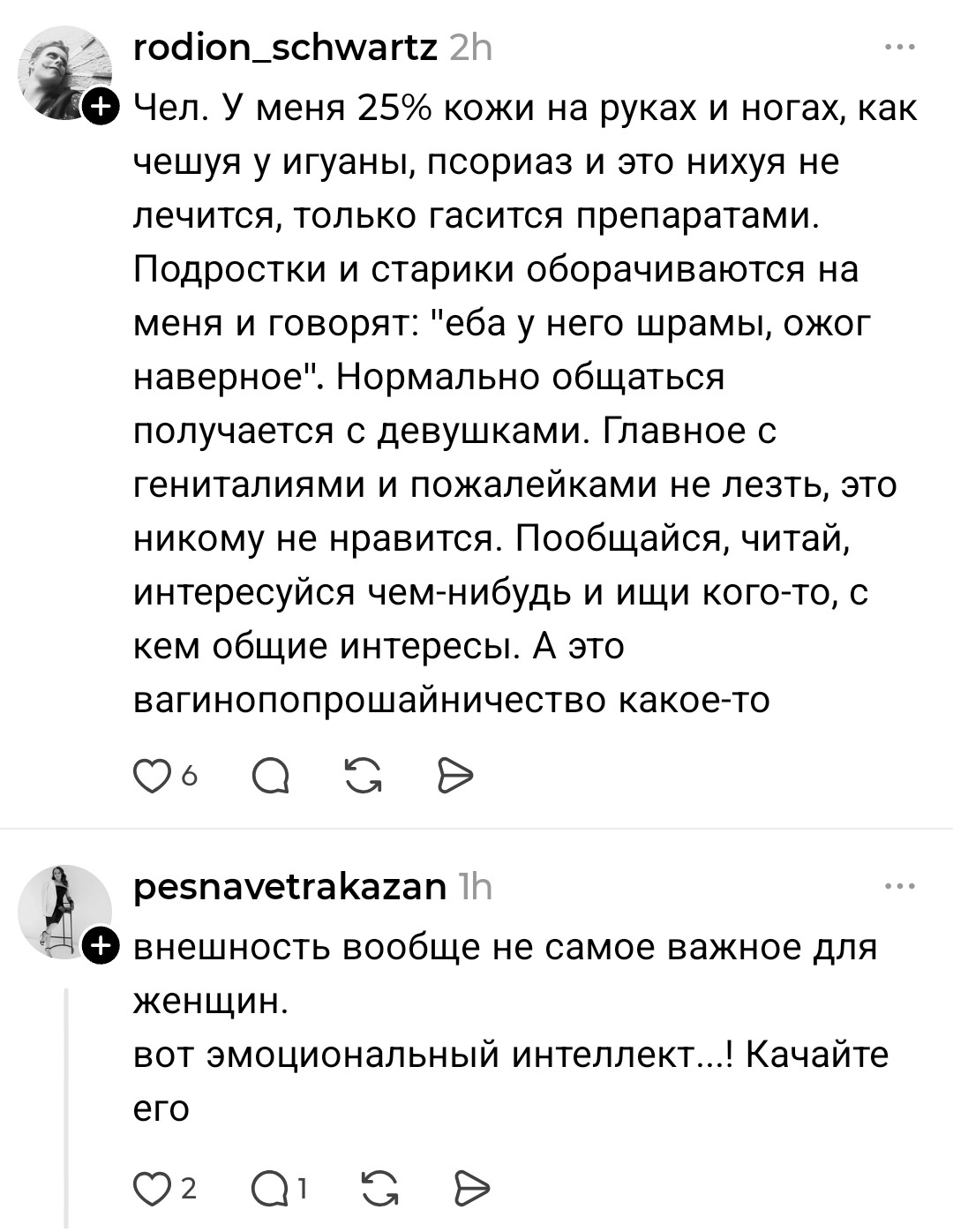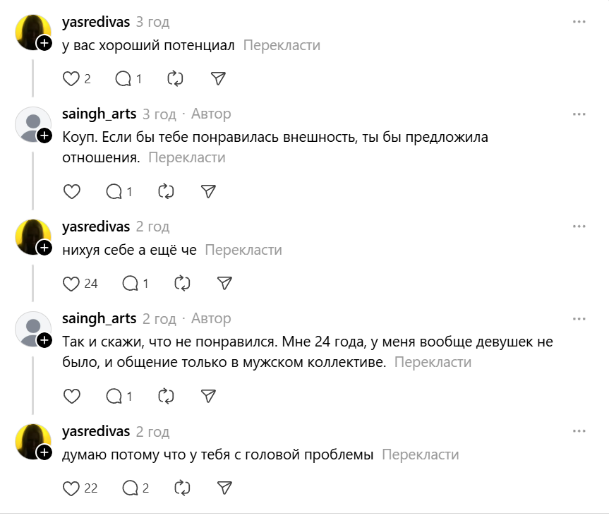 >>10449676 >ты очень симпатичный, если я правильно всё поняла. Если взять во внимание Тиндер:300 лайков за 2 недели было. Но ни с кем не вышел на встречу, диалоги пиздец были. 50 диалогов провел, контактами обменялся с тремя и всё. Остальным уже не было желания писать первым, просто фармились лайки. Но как Чеду первыми не писали, за исключеним двух тян с которыми общение было ни о чём. >Ливай из треда тогда Да всё уже, ливаю...