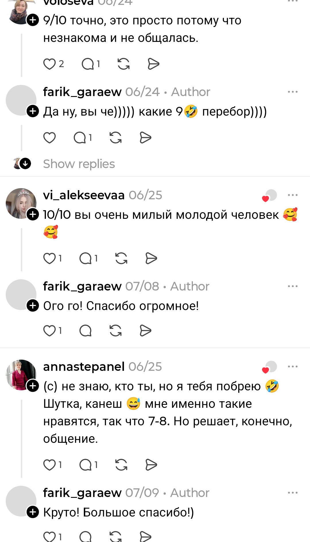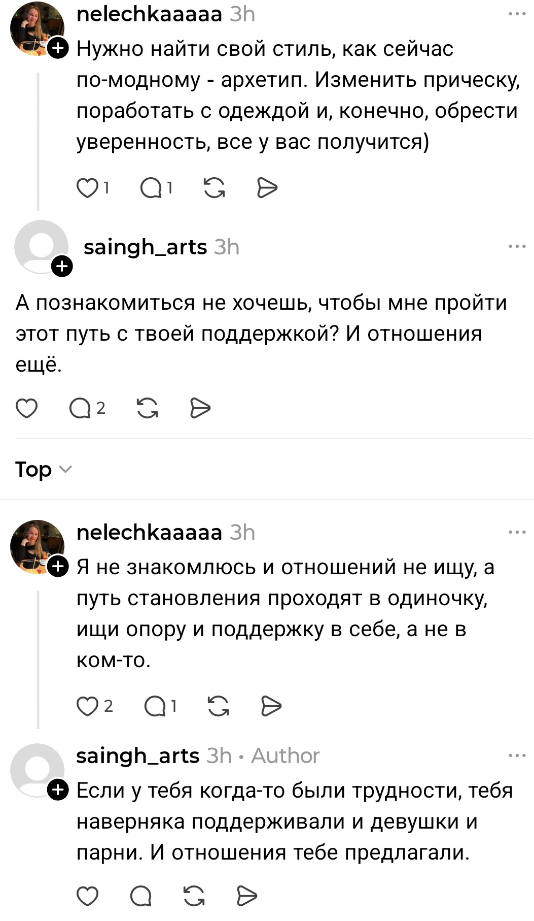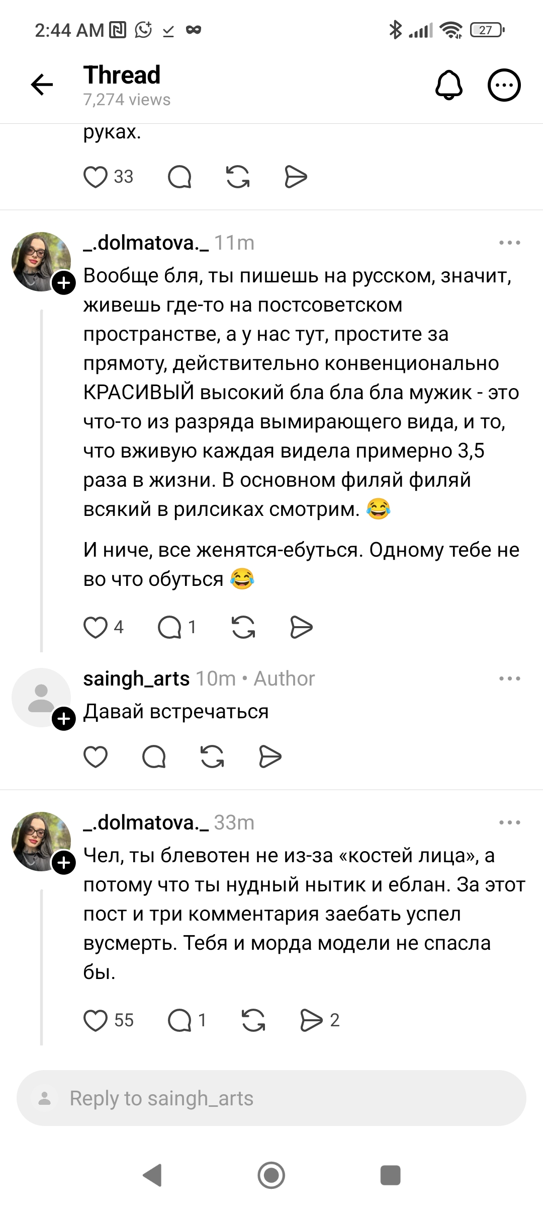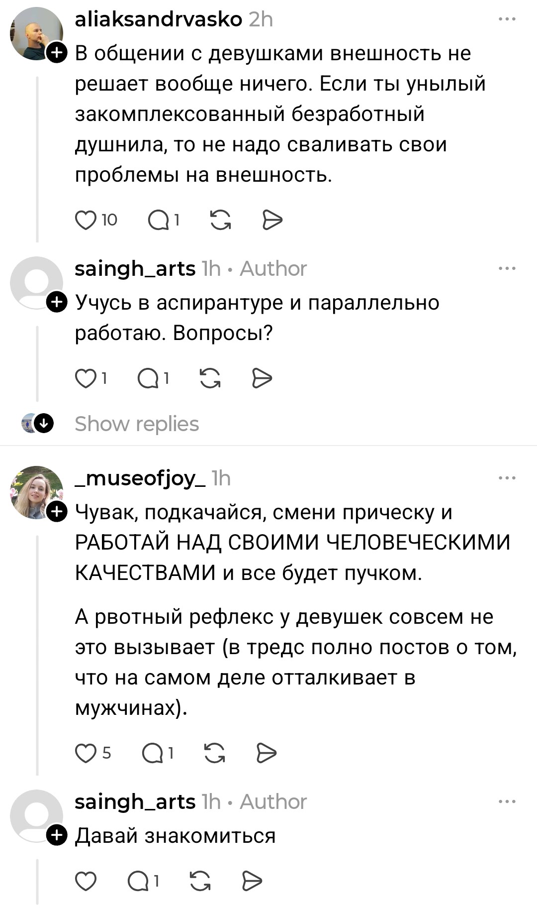 >>10449676 >ты очень симпатичный, если я правильно всё поняла. Если взять во внимание Тиндер:300 лайков за 2 недели было. Но ни с кем не вышел на встречу, диалоги пиздец были. 50 диалогов провел, контактами обменялся с тремя и всё. Остальным уже не было желания писать первым, просто фармились лайки. Но как Чеду первыми не писали, за исключеним двух тян с которыми общение было ни о чём. >Ливай из треда тогда Да всё уже, ливаю...