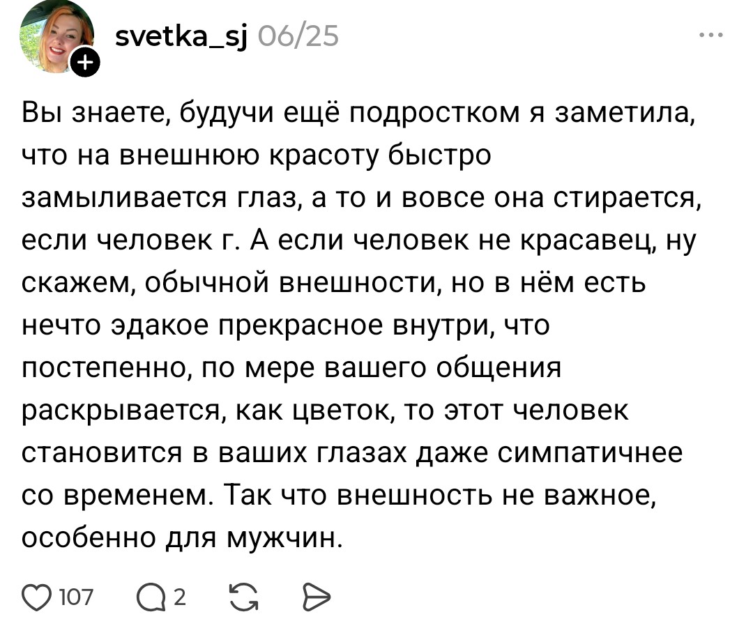 >>10449354 Давно расстались На самом деле мне общение с ней не было в тягость Единственная проблема - отсутствия желания и нежности ко мне, во остальном мне нравилось с ней быть. Мы гуляли много, катались на велах, смотрели кино, играли, обсуждали все на свете, вместе готовили и пили пиво, у нее очень хорошее отношения с моими родителями. Ну и она мне как женщина нравилась