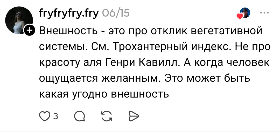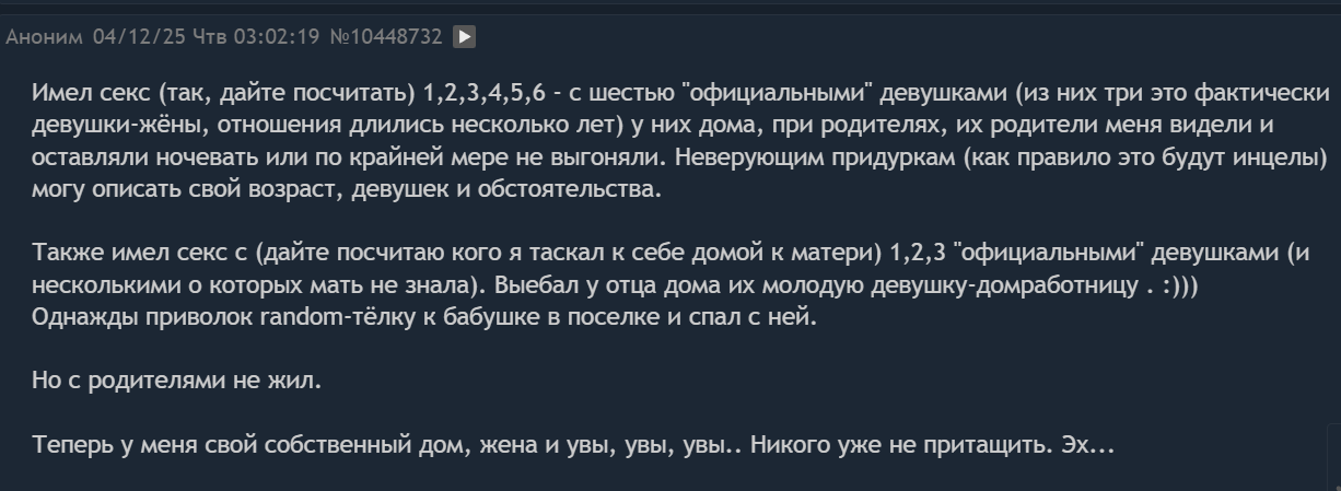 Хуй его знает конечно, отчасти они правы конечно, пару саб пять и вполне норм часто вижу, хз бетабакс это или нет. Но это молодость скорее, а вот выше 30 лет там бетабакс полнейший идёт. Вообще мне кажется у нас просто прошивка такая, типа как прокожонные, тяжело это объяснить. И это не ненависть к бабам, я например к ним хорошо отношусь, это что то другое как будто мистическое фаталистическое. Многие назвали бы это харизмой и обонянием, многи храбростью и мужеством. Хз инцел он не храбрый, отсутствует харизма, сломленный с детства. Это нихуя не лечится, только в кино такие находят тян, в ирл все совсем печально. Есть 1 лайфхак это жирухи. Полностью заплывшие жиром, некрасивые и ТД. Но мало кто может перечислить себя.
