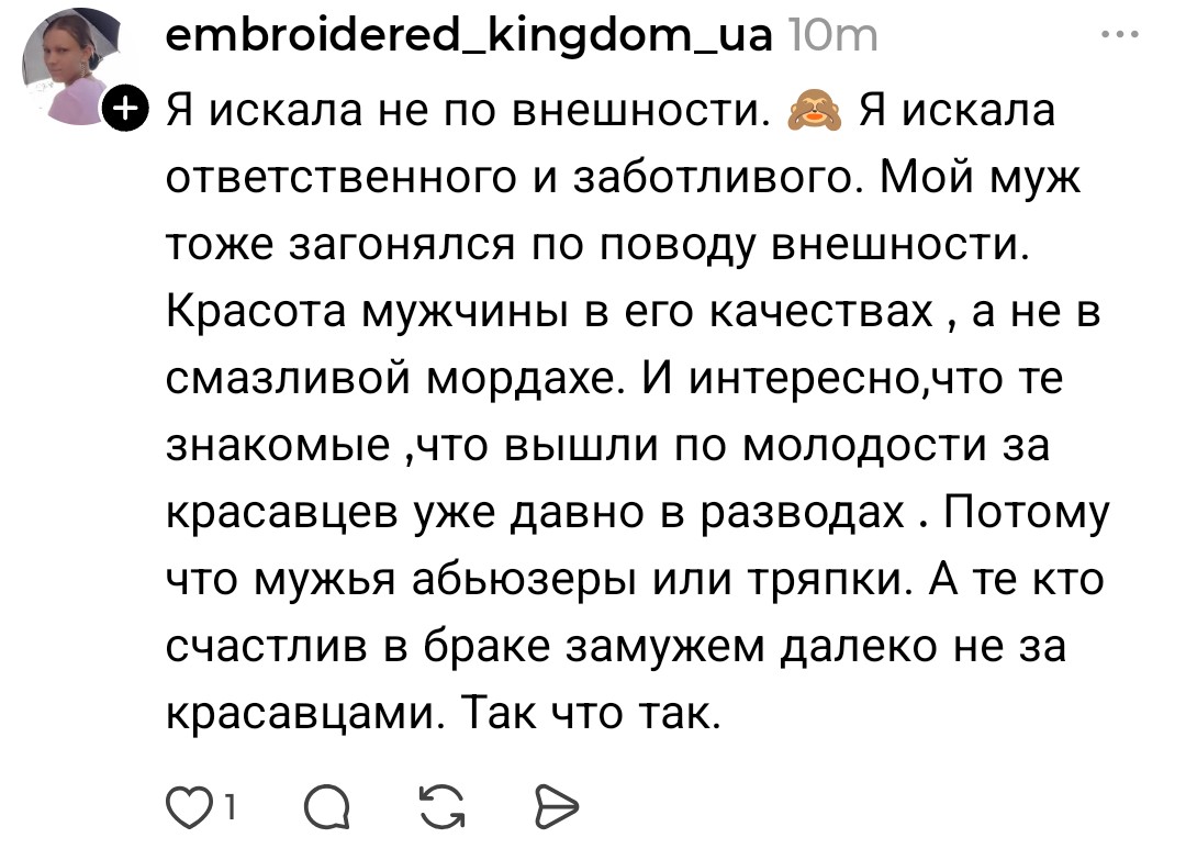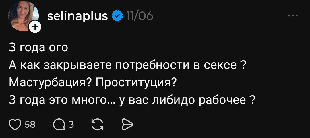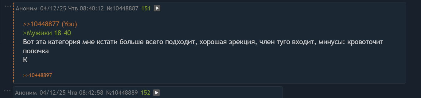 >>10449240 Так я же тебе написал, почему так в своем посте. Ты его то ли не читал, то ли просто упустил: мы говорим о симпатии, о сексе по симпатии, о желании со стороны женщины, а не про семью и тикающие часики и желание уже забеременеть и сесть на шею. Я тоже был удобничем для семьи и у меня был секс. Только по моей инициативе, и только по ней, без желания с ее стороны, поцелуев, страсти и т.д Это даже не секс, а реально как работа для женщины была. У меня был эксперимент, когда я больше трёх месяцев ее даже не трогал и знаешь что? Все эти три, почти четыре месяца у нас не было не только секса, но даже поцелуев, объятий. Мне надо упоминать о своем росте и внешности или сам догадаешься?