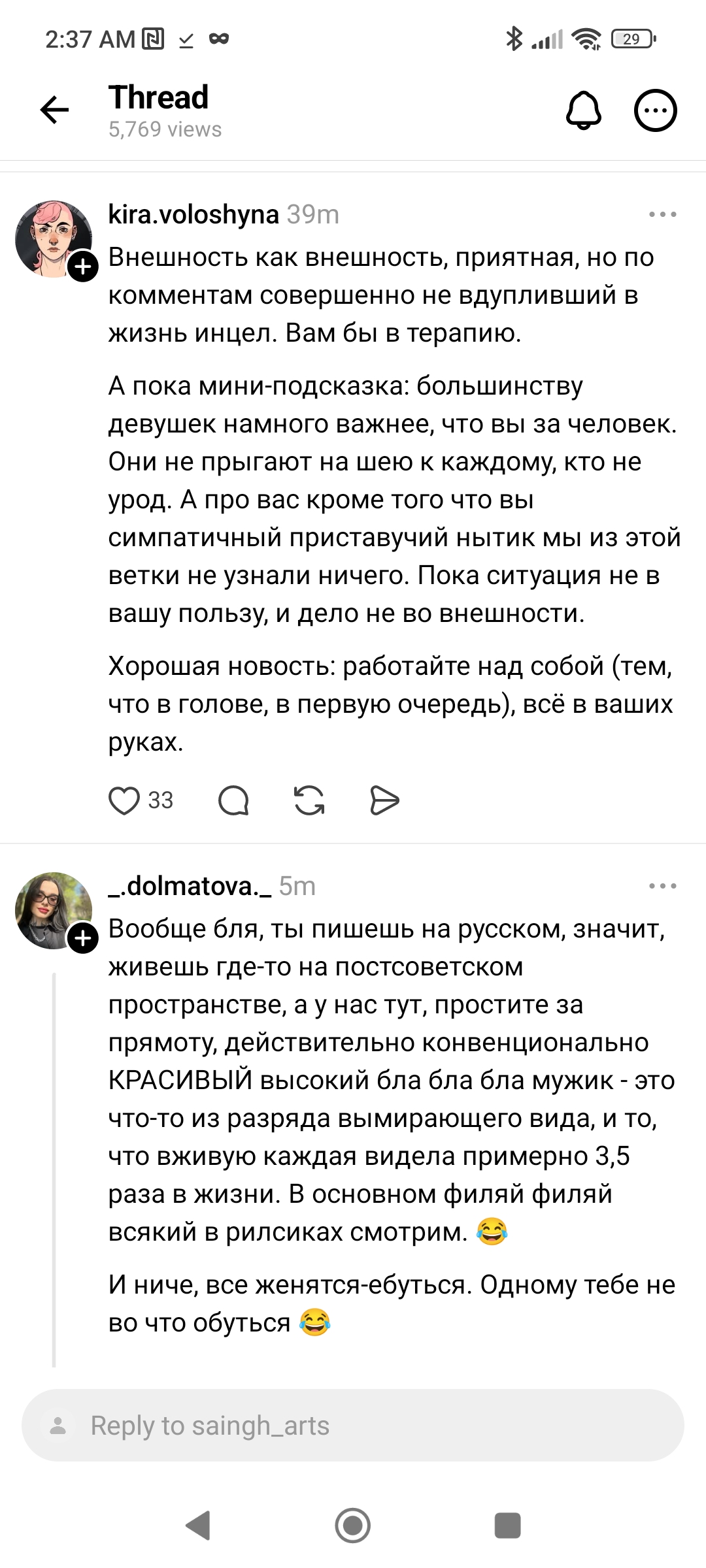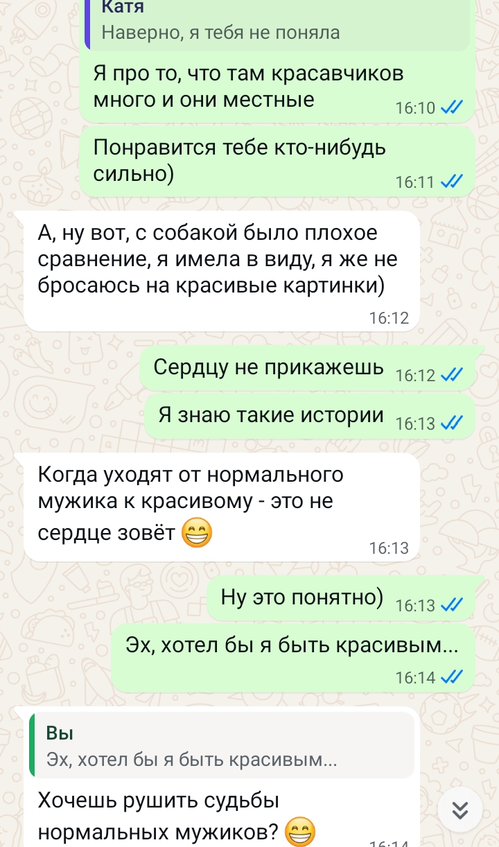 К, а 180 это норм рост? У меня вот такой, вроде не урод, своя хата+тачка+"уважаемая" профессия врача Итог - 20+свиданий за 2 года потужных попыток, почти все после первого слились, остальные после второго, максимум один раз в засос целовался, но я сам хз, что это было, как будто бог мне демоверсию спустил с небес, чисто на недельку, потролить