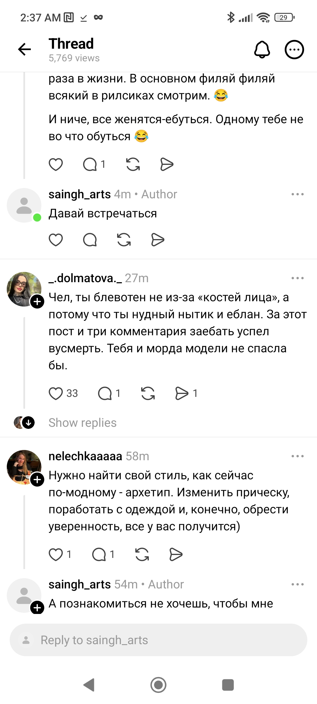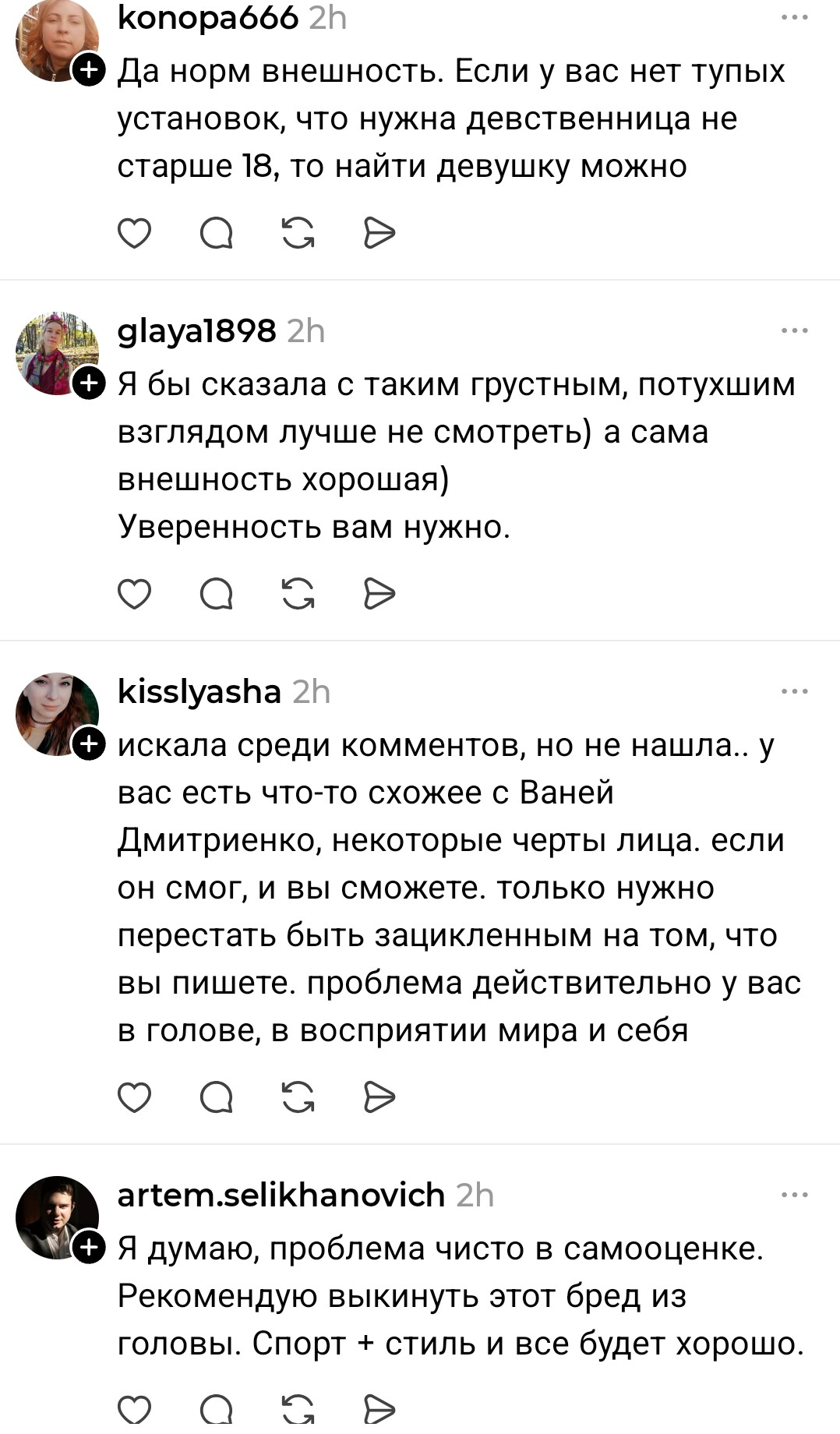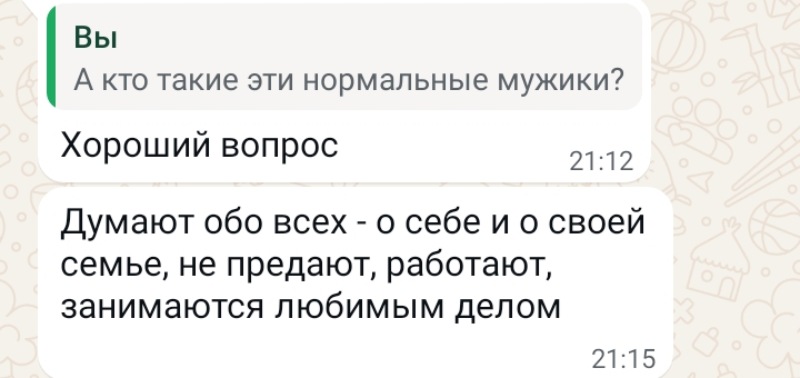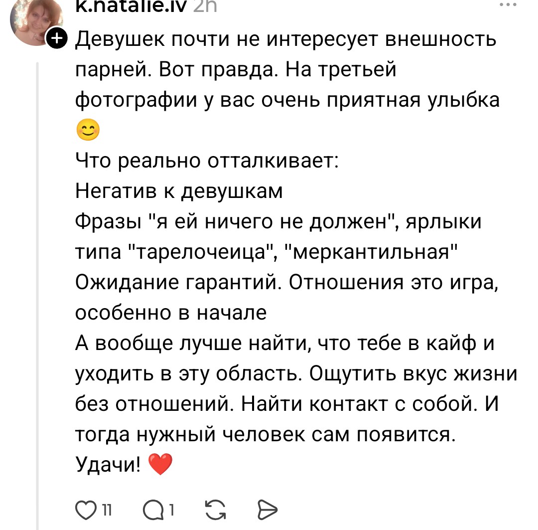 Нужен совет, тян. Не из дев. Не стрёмная не невзрачная, не нарцисска. Относительно новенькая здесь. И скорее в моей ситуации дело в неуверенности в себе как таковой. Смотрю вокруг, вижу и понимаю, у самых разных девушек есть парни, всё окей, но сама загоняюсь, что одна, копаюсь в себе, может частицы стиля не те, может поведение, может какие-то другие вещи, люди, детали. Хотя вроде всё в пределах нормы + выделяюсь, внешне няша, очень многим нравлюсь. По характеру тоже, на старте общения всё заебись, как личность всё ок. Опыт отношений был. Не знаю короче, не понимаю, почему я одна. То на меня смотрят и я нравлюсь, то никто не знакомится и всем поебать, Как будто бы, все вокруг уже заняты И причём, повторюсь, заняты самыми разными девушками. Это могут быть, как сейчас принято говорить, дефолтные, могут быть девушки «шалавистой внешности» или ещё какие-то, могут быть прям не выделишь из толпы. Но мужчины так устроены, что для них любая очень привлекательная. Я понимаю, что это не форум с психологами, но че делать с установкой, что я будто никому не интересна? Это не про нарц майндсет, мол за мной должны все бегать, а взгляд со стороны на то, как происходит у девушек, парни сбиваются в стаи и бегут за писей Без хейта, может, накидаете мыслей