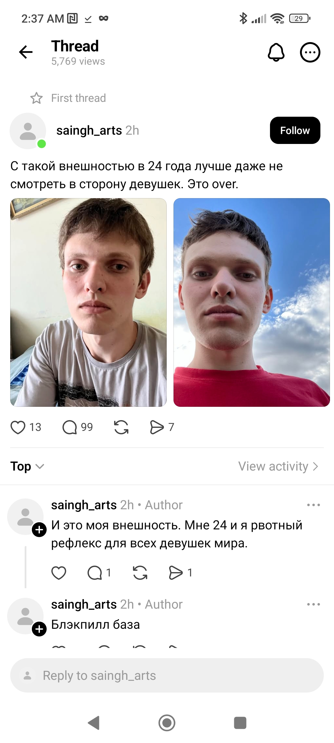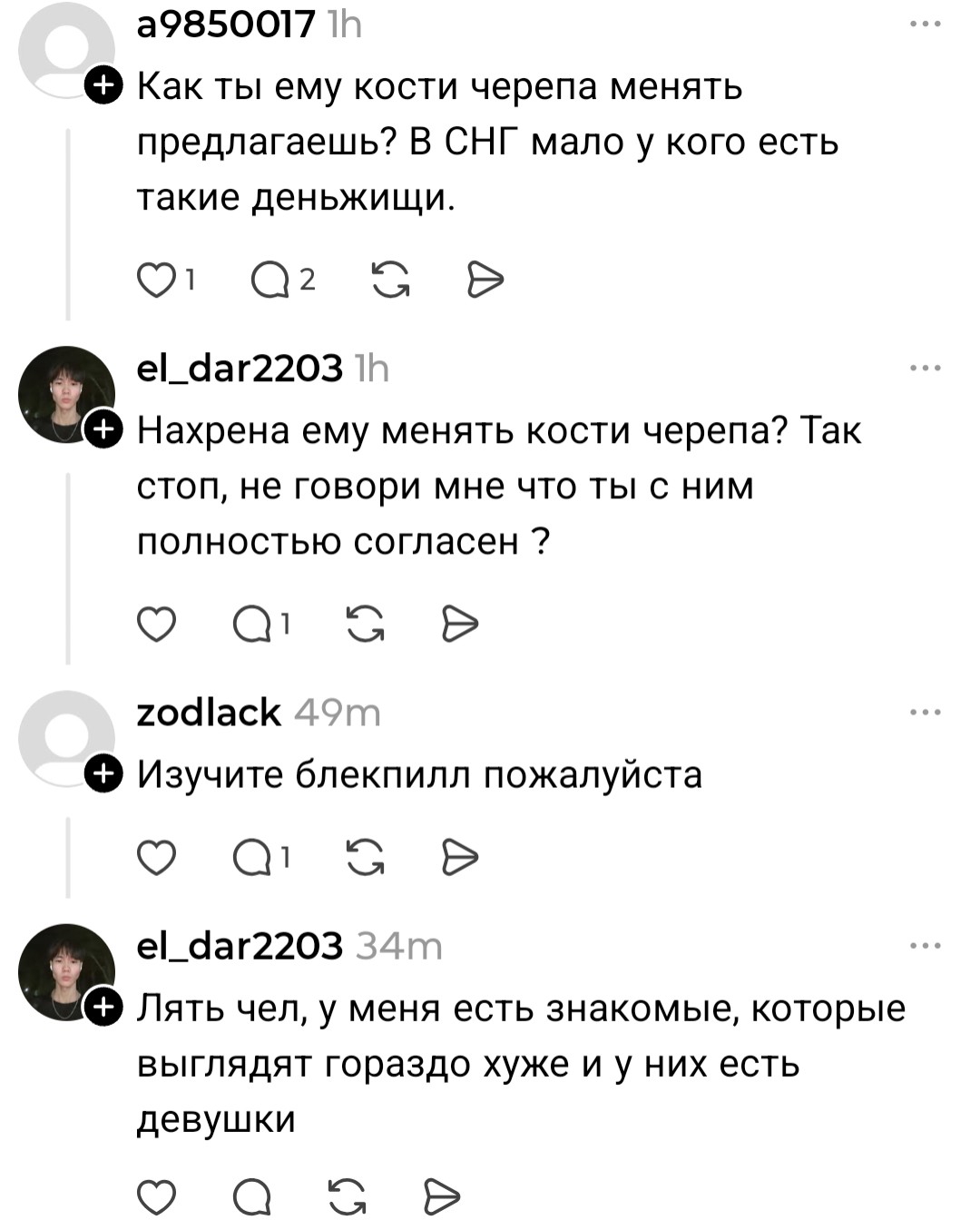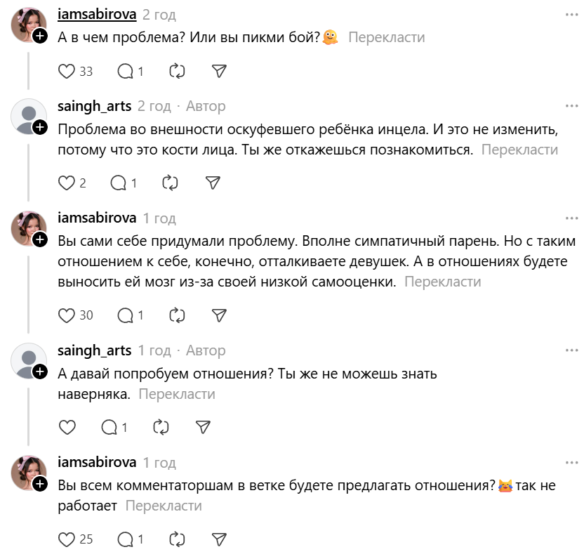Тупо газлайтят чела, как всегда >>10449364 у женщин в прошивке отрицать блекпилл, я не знаю зачем. То есть если этого же парня запостить в любом другом контексте, то его будут обливать помоями и говорить, что он урод, но если он сам говорит, что он урод, и ему никто никогда не даст, то как ни одна не скажет что он урод, будут газлайтить. Мне кажется, это связано с эволюционной адаптацией, ведь самки слабее и грубо отказывать им опасно, потому что может по ебальнику прилететь от обиженого энцела. Поэтому нужно всегда придумывать какой-нибудь предлог. Плюс, если не отказать напрямую, то можно лошка оставить во франзоне и он тебе будет приносить профиты. В общем, нету совершенно никакого смысла отказывать напрямую, зато есть смысл этого не делать.
