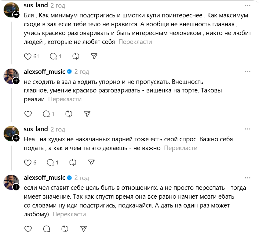 >>10449303 Тян помоложе со своими данными? Анон, ты сейчас серьезно? На бетабакс, как ты понял, я рассчитывать не могу, потому мы и расстались из-за того, что вероятную семью я тянуть не мог Один из наших с ней диалогов, кстати. А однажды она мне вообще сказала, когда мы обсуждали внешность, что за красивого мужчину замуж бы не пошла и серьезных отношений строить не стала бы, потому что они не надежны, гулены, на них куча женщин западает Я так опешил, что даже ничего ей ответить не смог и не спросил, мол, получается, я для тебя стремный, раз со мной ты готова на семью?