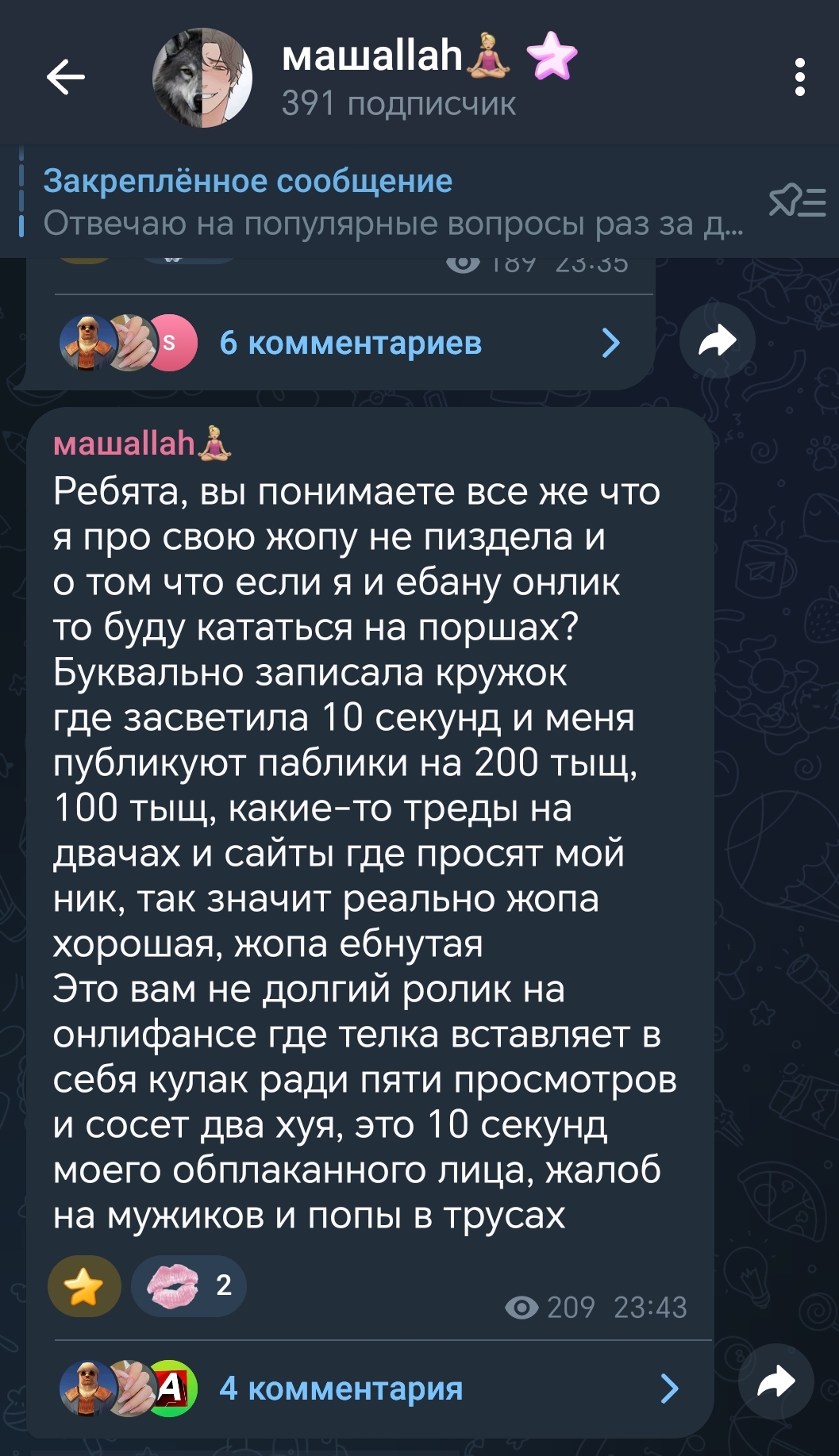 Какие от тебя вайбы челика из деревни, который всем рассказывает: ну и что, что я в мухосранске хуй без соли доедаю, пока славик в маскву уехал и за 300к\нсек работает, зато я на девятке батиной телок катал.