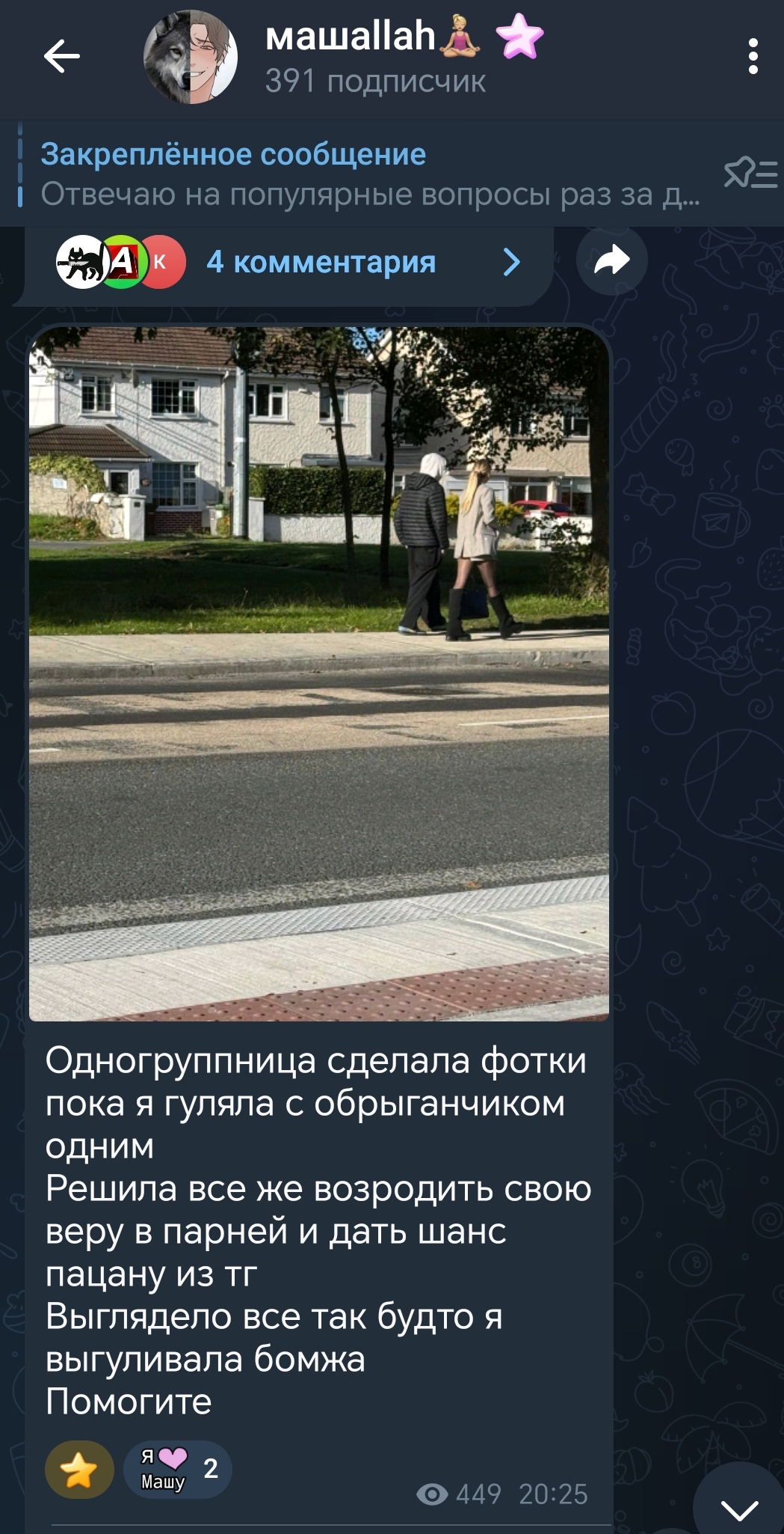 Мне тут не надо ничего обесценивать, за меня это делают тянки. Вот я как раз и есть тот чел, про которого ты пишешь: сам из деревни почти, с батей все детство строил дом, спорт, тусы с телочками, походы на 200 км, вот это все. Плюс мозги и хорошее образование. Сам можешь представить, какой у меня выбор и из каких тян был и сколько у меня знакомых из разных страт.