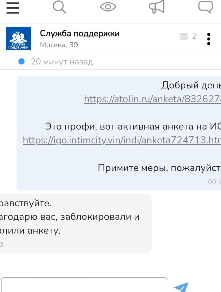 https://atolin.ru/anketa/8331887 Тоже писал, ответила, но там забей клиника, это какое-то редкостное чудо с ебанутым ЧСВ. Но мб и не профка, потому что запросы там были озвучены ТИЛЬКО СИРЬЕЗНЫ АТНАШЕНИ от 500к/мес. И походу ждет оно минимум неженатого преттика, который на 3-й месяц замуж позовет. Ас - нет, минет - нет, "нравится только классический НеЖнЫй секс ^___^". От 50к за встречу оно отказалось с видом "ты за кого меня принимаешь" (реально платить не собирался офк, ради рофла предложил). Нахуй ее короч, ну или ее приземлят через неделю-другую.
