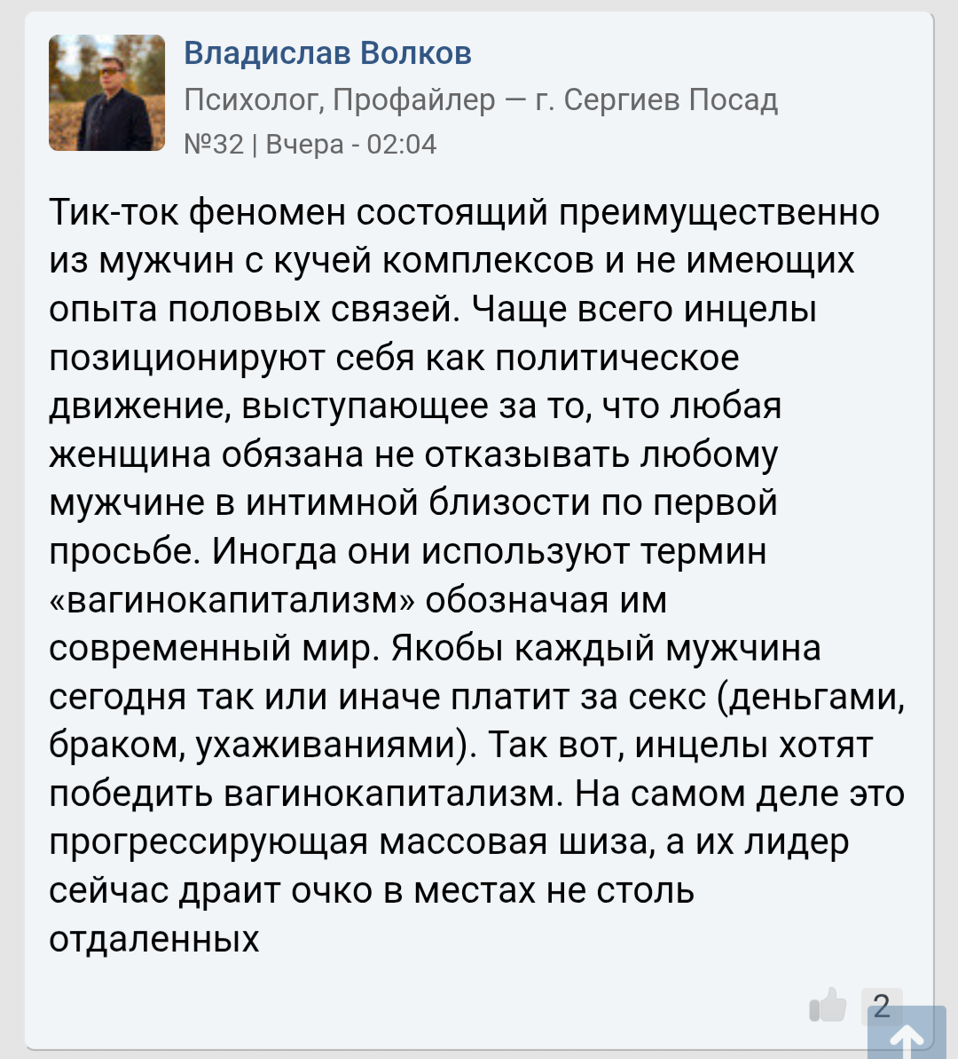 >>10467459 Я инцел, я смотрю ильюшу со старших классов (получается 5+ лет уже), он мой единственный друг. Я когда в чат смотрю мне кажется там солидный процент инцелья. Приятный, умный чел, фоном кайф поставить послушать. Конечно клоун, но я тоже в какой-то степени клоун, это даже здорово.
