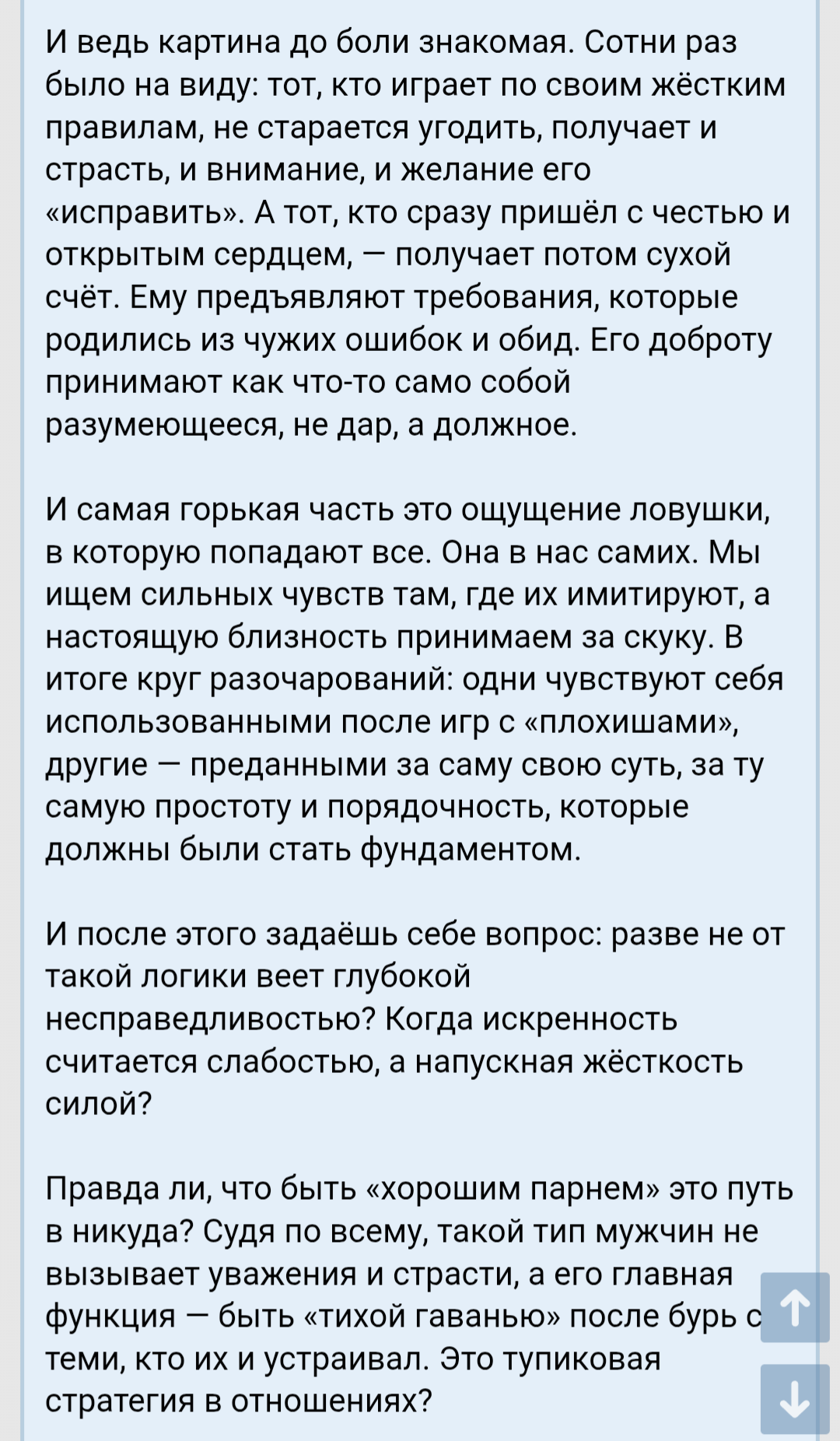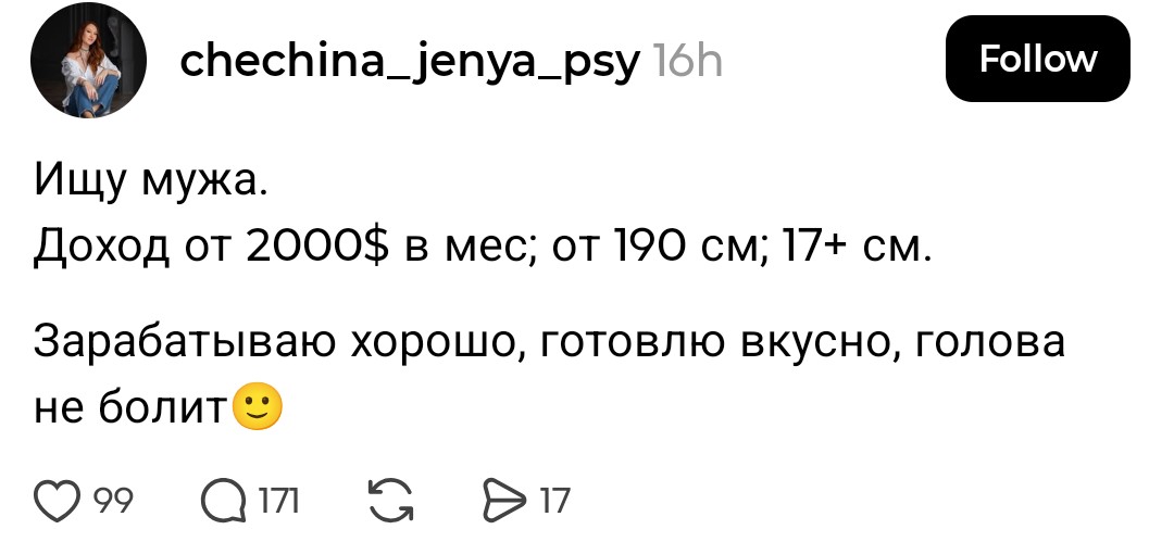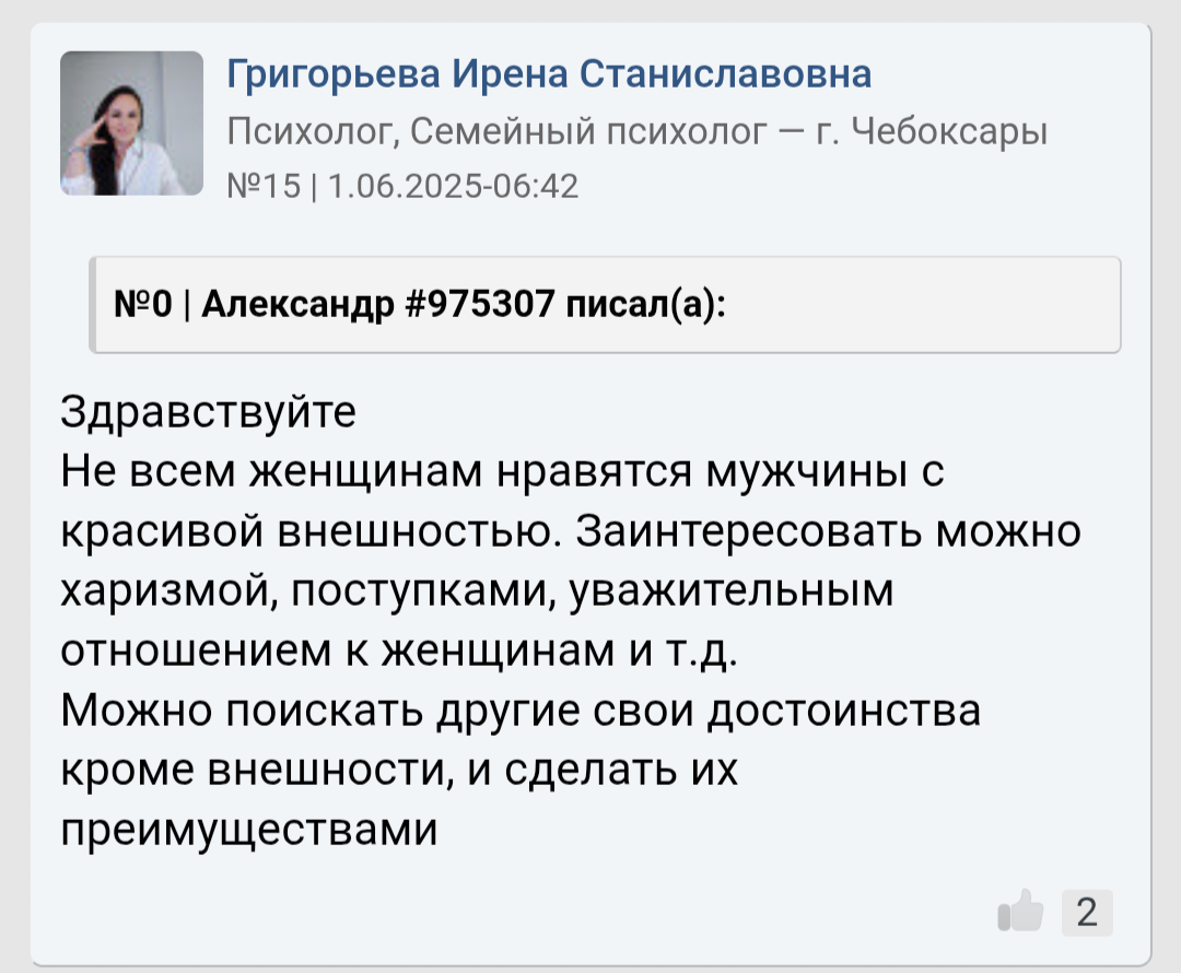 Здравствуйте, случайно увидел этот тренд, и решил написать. Я 187, сейчас мне 31, и возможно я идиот, как у Достоевского, то есть мне не очень понятны социальные отношения, то что всем все сходу понятно, а мне не очень. В 2022 году я встретил в рюмочной дс2 азиатку такую полную, вроде симпатичную, она сказала что была сходка двача и ее тут кинули. Короче пили с ней, о биопроблемах началось, не помню что я говорил, но зато помню как она на меня закричала прям ТЫ ЕБАНУТЫЙ, ТЫ ЖЕ КОНВЕНЦИОНАЛЬНО ОБЩЕПРИНЯТЫЙ КРАСИВЫЙ ВЫСОКИЙ БЕЛЫЙ МУЖИК ХУЛИ ТЫ ТУТ ВЫЕБЫВАЕШЬСЯ, а я реально не имел ввиду, и забил хуй. А тут, уже тридцать лет, скуфею потихоньку и вспомнил тот случай, призадумался. Посчитал количество романтических отношений за всю жизнь, это 19 получается и понял что ноль раз мне приходилось этих отношений добиваться. Реально не могу вспомнить момент чтобы был, ну понимаете, конфликт какой-то, отказы какие-то, кроме совсем курьёзных случаев. Это всегда было, о привет, мы же знакомы, ну приходи туда, а там привет по пиву и тебе писю начинают сосатьтакое было только дважды Но самые лучшие девушки, которые мне больше всего нравятся до сих пор проходили прям прямой наводкой, о привет а ты кто? И как будто уже ты в моменте, в голове начинает все само тазом рычать. Несколько замечаний: 1)Пару раз в неделю катаюсь на метро дс2, чувствую себя годзиллой, люди это гномы, не в обиду, если вижу человека выше то прям подмечаю, это редкость. 2)В 30 лет понял что у меня есть навык или талант от природы, в любых переговорах, по работе например, вместо споров и логики, доводов там, можно просто включать низкий громкий голос, особенно хорошо работает по телефону, экономит всем сторонам время просто бубубу и все согласны сразу. Если вижу мужчину который так всегда разговаривает, то это смех, неприятно как-то. 3)СЗ со стороны женщины это пиздец, есть подруга ей очень на лицо повезло, прям оч красивая, наша с ней развлекуха была крутить женихов выбирать ей, там такие кадры, никакое владение бизнесом или бабки этот цирк никогда не уравновесит. Ну если хочется прям отношений, секс за деньги не в счёт.
