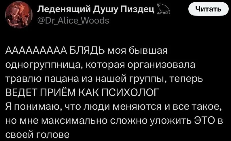 >>10468743 Возможно, но мне интересно как тянки с подковыркой это делают, не просто "ты страшный иди нахер отсюда", а с таким оборотом будто у меня комплексы и я не могу реализовать себя с красивыми тянками. Наверно это чтобы я их не обозвал или ляща не прописал.
