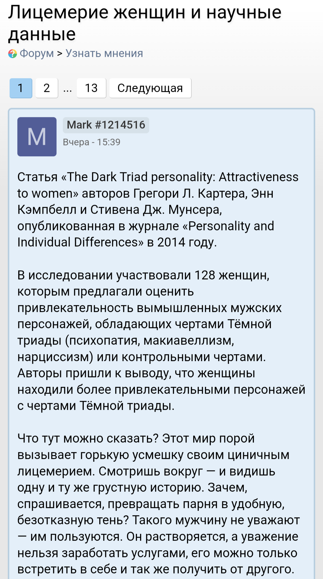 Из всех своих подкатов, да и в принципе наблюдений, заметил, что у умных тянок все мужья и парни повально додики. То есть я могу не знаю, наверно даже ляща отвесить - натравит кого-то (ебыря мб), потихому обратится куда-то, но даже не подумает своего несчастного на такого же инцела бросить. Смешно конечно.