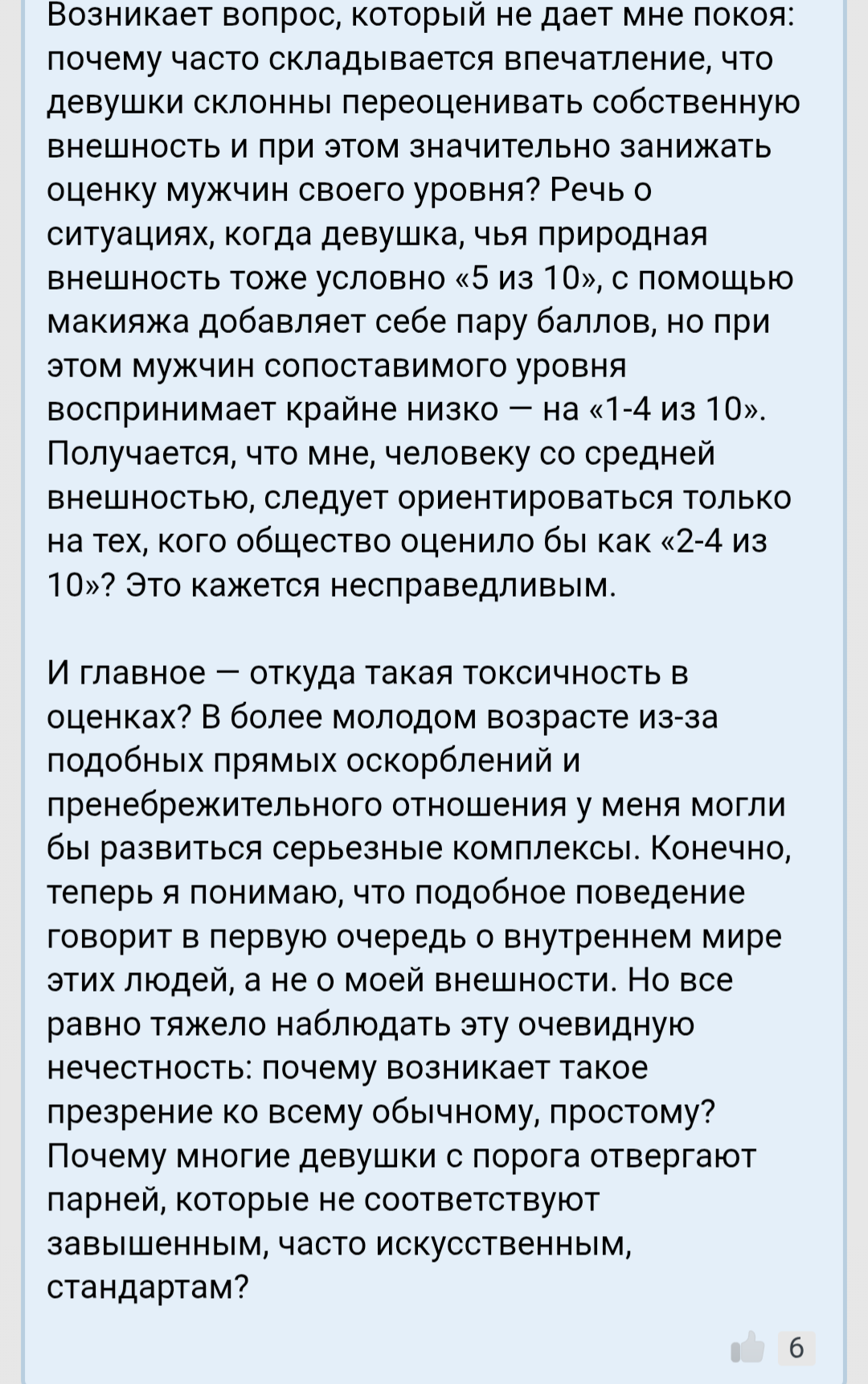 Мне вообще кажется что нас промыли что у нас тянка должна быть и это нужда как воздух. Я помню лет 12 назад когда на первую работу пошёл и начал вдуплять что к чему понял что машины у меня походу никогда не будет, да и красивой жизни тоже. А всем ведь тогда навязали успешный успех что тачка по любому у многих должна быть. А по факту страдания были не из-за того что тачку не могу купить, а что было ощущение будто я как инвалид какой-то, будто у меня конечность вырвали, отсюда загоны тяжёлые были.