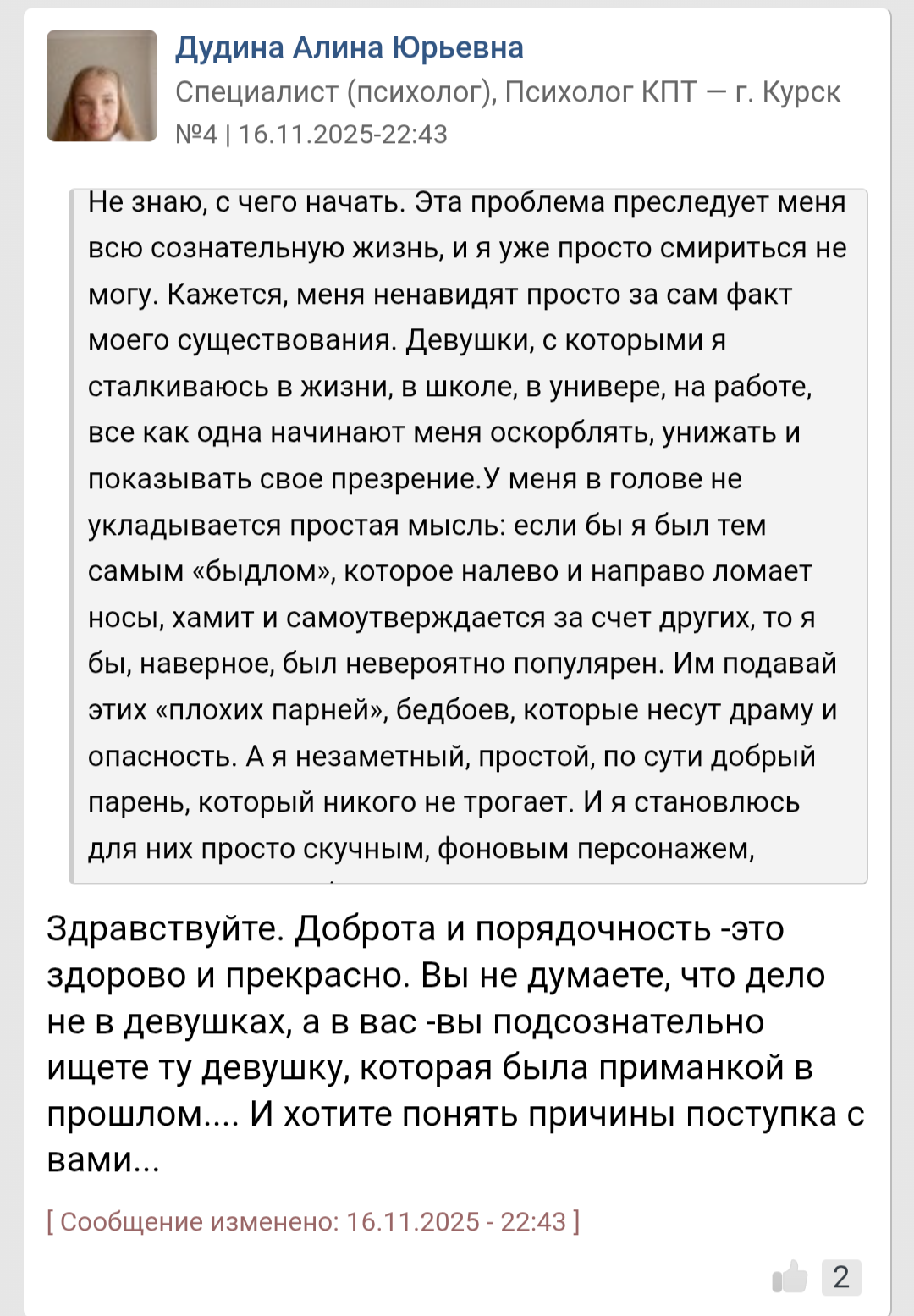 Вы вообще тут ебанулись со своей хорошестью. Вот знаешь ли бывают такие бабы жутко слабохарактерные мазохистки, вечно ищут самого дерзкого самца защитника, а в итоге находит избивающих арбузеров, изменяющих, лудоманов. И вот ей 35 и у нее вся история отношений это кромешная тьма. И ни один более менее нормальный чел ничего строить не хочет с ней. А ей дурочке говорили подружанки, что прекрати хуйней заниматься, хватит самых ебнутых мужиков пригревать, а она не слушала, дурочка. Вот и вы тут все дурачки. Вам говорили жимцелить, луксмаксить, развиваться, а вы себя выше этого ставите, мол чедикам же все просто так, а у меня уважение. Ну и вот вы сидите в этом черном болоте обиды, и никто не захочет давать вам шанс, потому что вы совсем уже ебнутые тут, если вас не смущает шапка треда, и вы не против ассоциировать себя с таким.