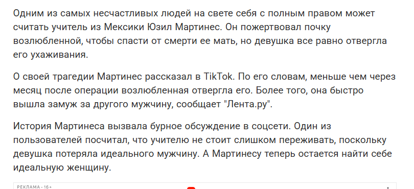 >>10470578 > был даже чувак который почку пересадил телке больной по которой пиздострадал, а она ему не дала после этого и вышла за какого то абрека. сторе срочна!