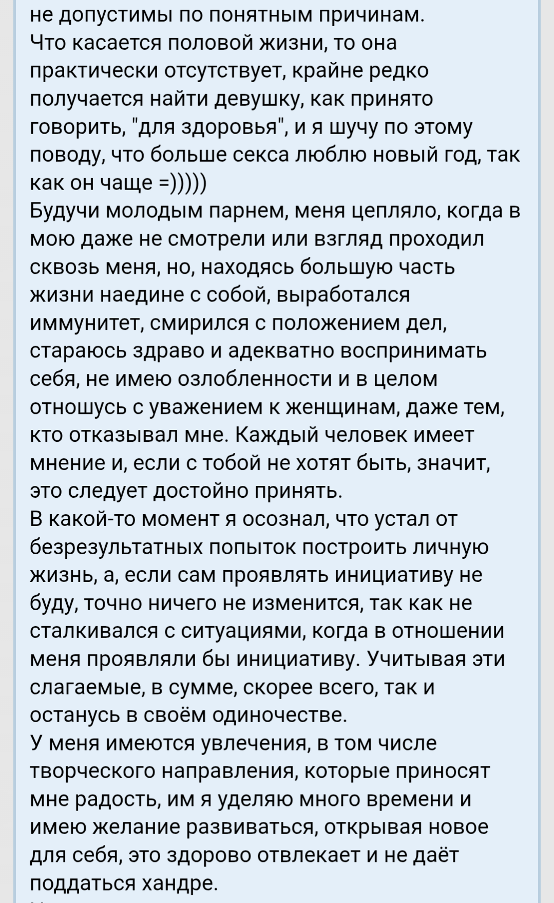 и с ней был опыт отношений тк всех остальных морозил и держал на ебанутой дистанции и дропал после их признаний тк мне хотелось только с кем-то дружить