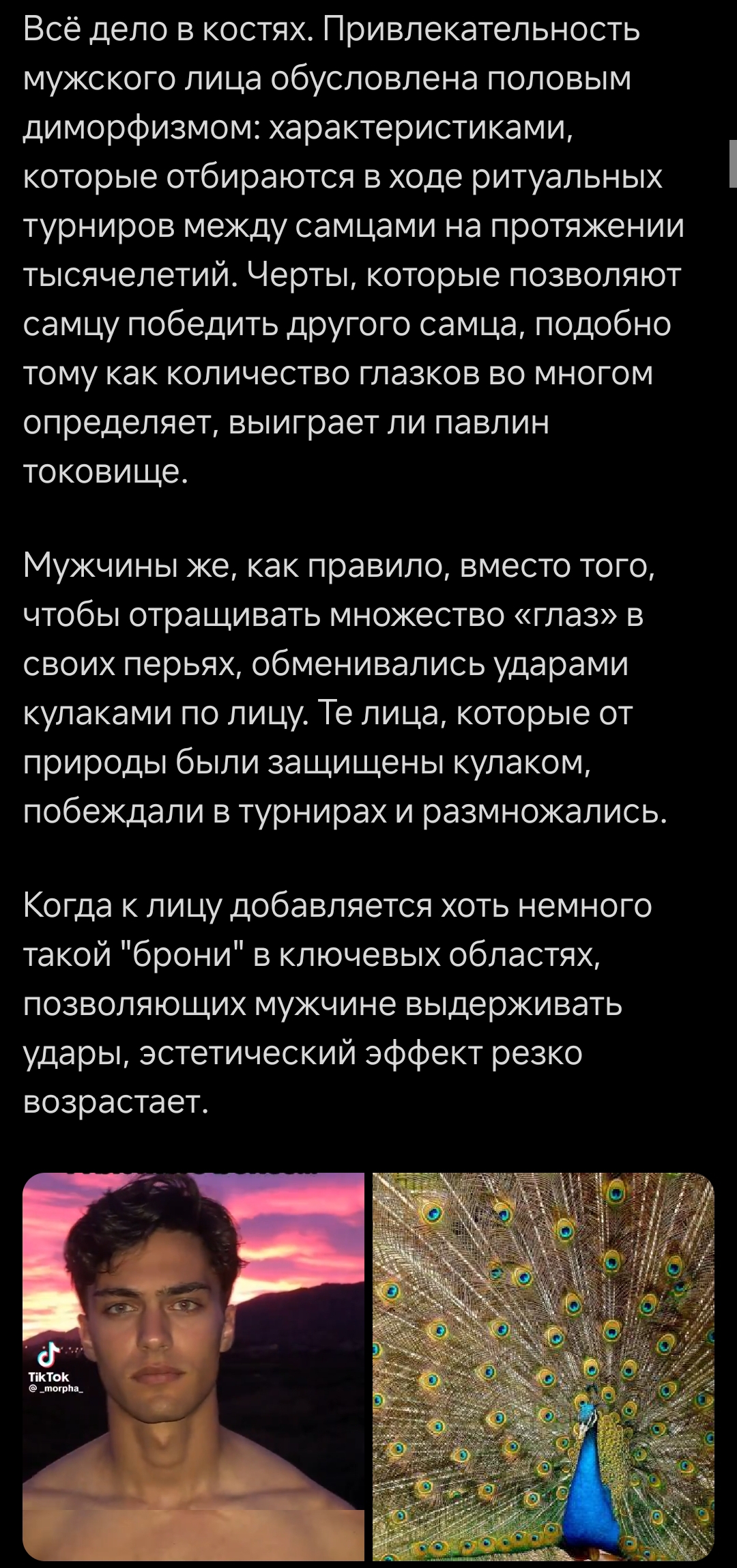 >>10491339 → >Там все чеды как наподбор, среди них очень сложно найти даже просто хай-тир нормиса. Это фенотип по [устаревшему] типологическому подходу Утверждение неверное, просто на форумах в качестве образца постят чедов в качестве образца Что по ним говорит вообще генетика? Наверняка доля каких-нибудь скандинавских охотиков-собирателей, это надо в хистораче уточнять >А как раз рудименты кроманов и неандерталов, чьи гены получили европейцы, приводят их в итоге к тому, что они монетезируют факт течки писечки на них. Если ты так фетишизируешь на неандертальцев то тут образец не норды, а австралийские аборигены или восточные азиаты. У них больше всего примеси неандертальцев по человечеству. Местами более чем в два раза больше чем у европейцев. (Правда, никаких рудиментов архаичных людей в и телосложении пока не нашлось, кроме может быть строения зубов от денисовцев) >Человек эволюционно как раз стремится к инцелу - уменьшение челюсти, уменьшение количества зубов, перестройка телосложения к менее боевому. Одна из главных, если не самая главная черта чедов это подбородочный выступ, вкупе с массивностью самой челюсти. Эволюционно челюсть уменьшается, а выступ то наоборот растёт. Он вроде для речи нужен. Говорить можно и без него (ну как неандертальцы, питекантропы) но косноязычно, а сапиенс самый социоблядский вышел.