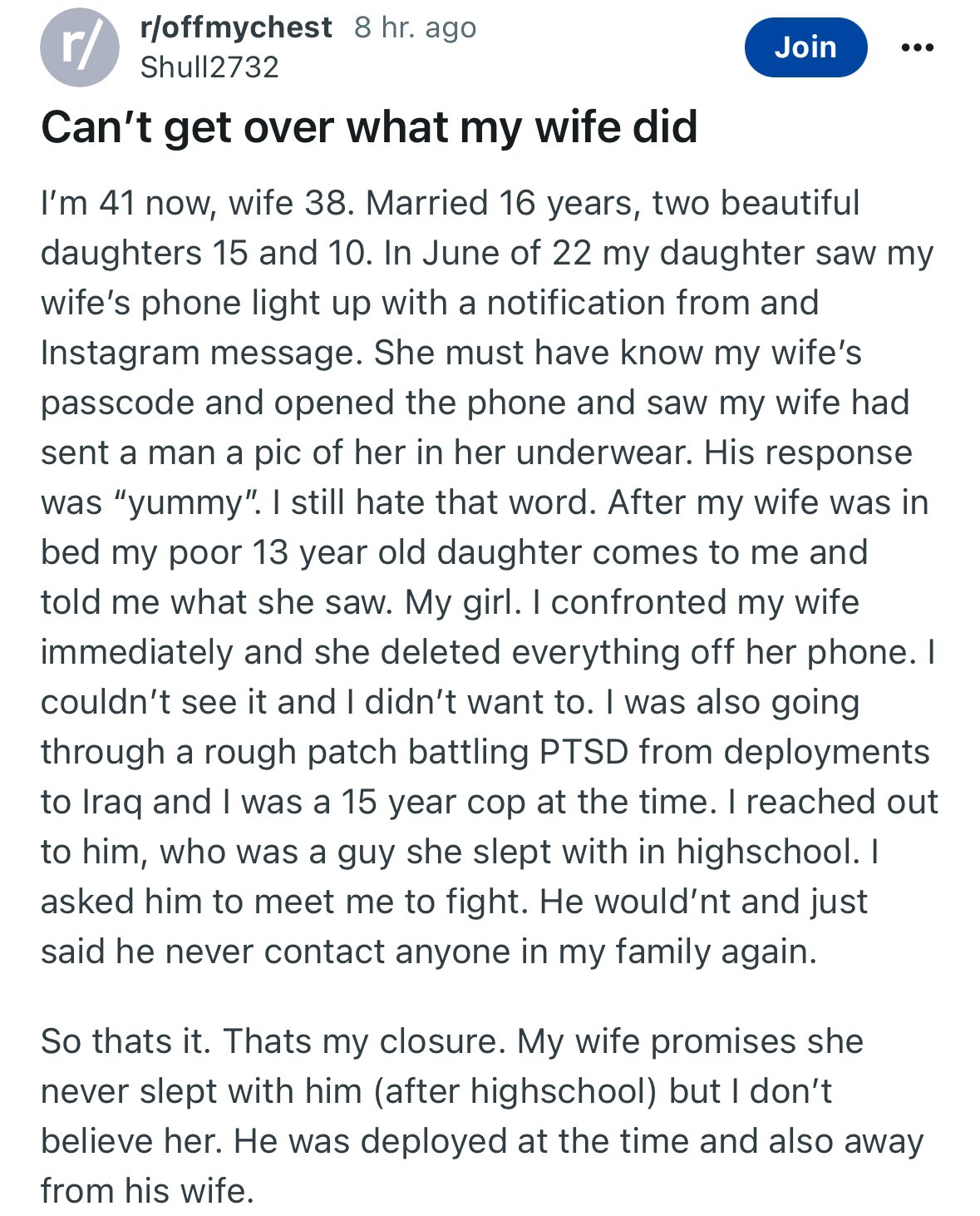 >>10492439 Ко мне подкатила лет пять назад у друга в гостях его знакомая РСП старше меня на 5 в мои тогдашние 35лет с двумя детьми. И когда я отказался с ней семью строит, она ну очень возмутилась и всем своим видом дала мне понять, что я счастлив должен был быть. Потом посмотрел ее бывшего мужа - типичный чедик под 190. Ну а я, блядь, гожусь только на доедалу