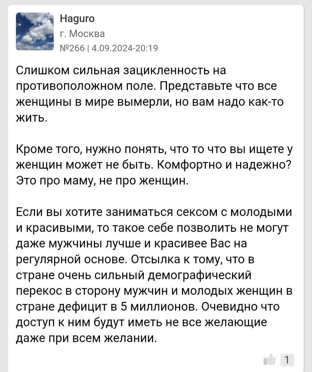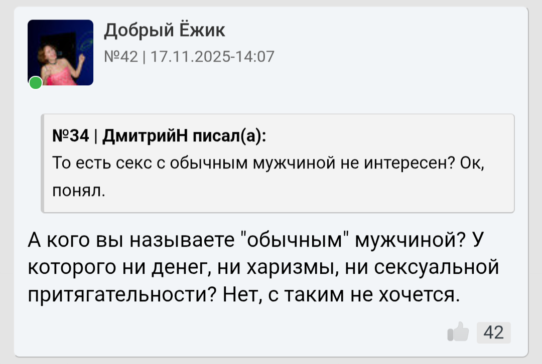 Вот. Об этом я говорю. Кто то просто туповатый сукин сын с IQ хлеба и тянок в упор не видит. А кто то как лягуш каждый день только и мечтает чтоб на него кто то да глянул.