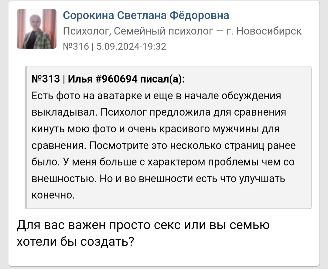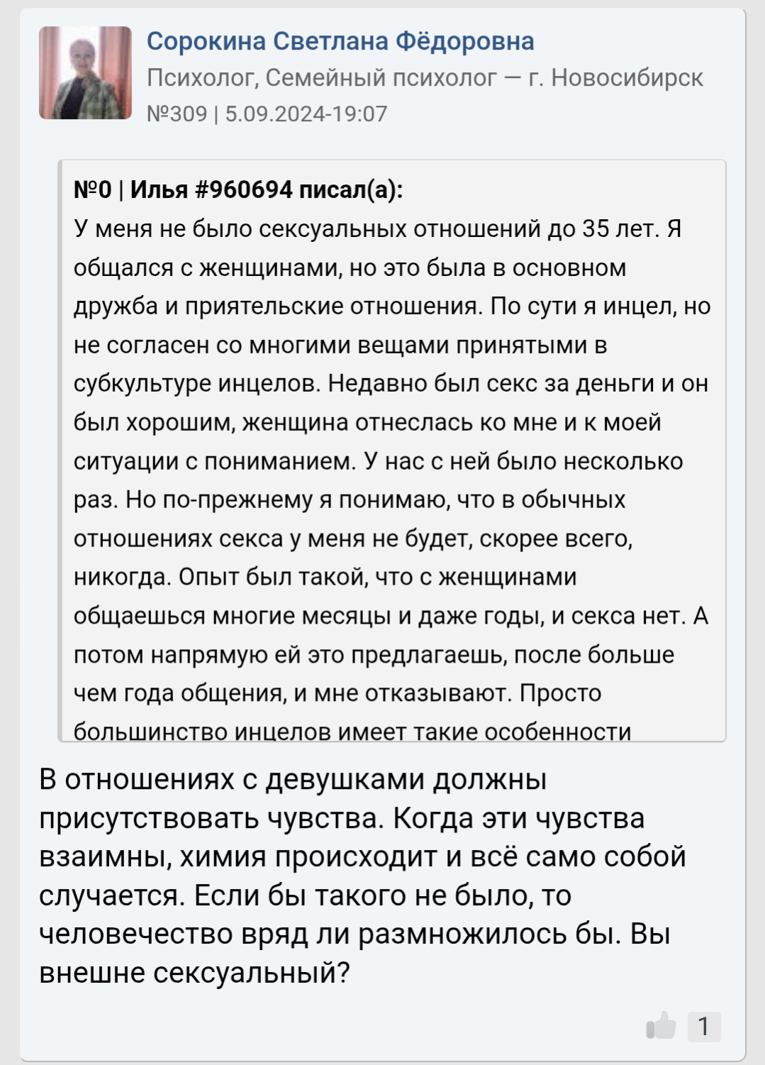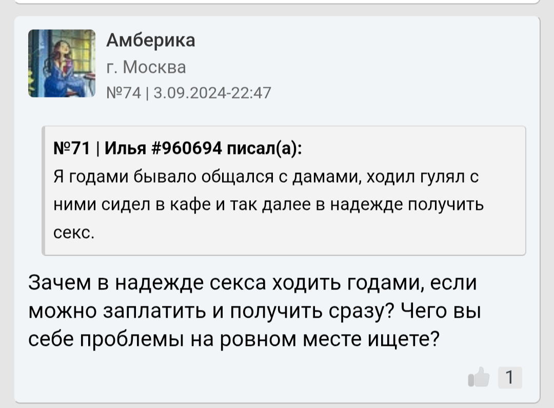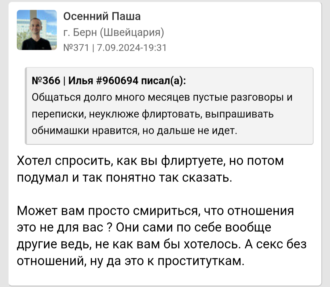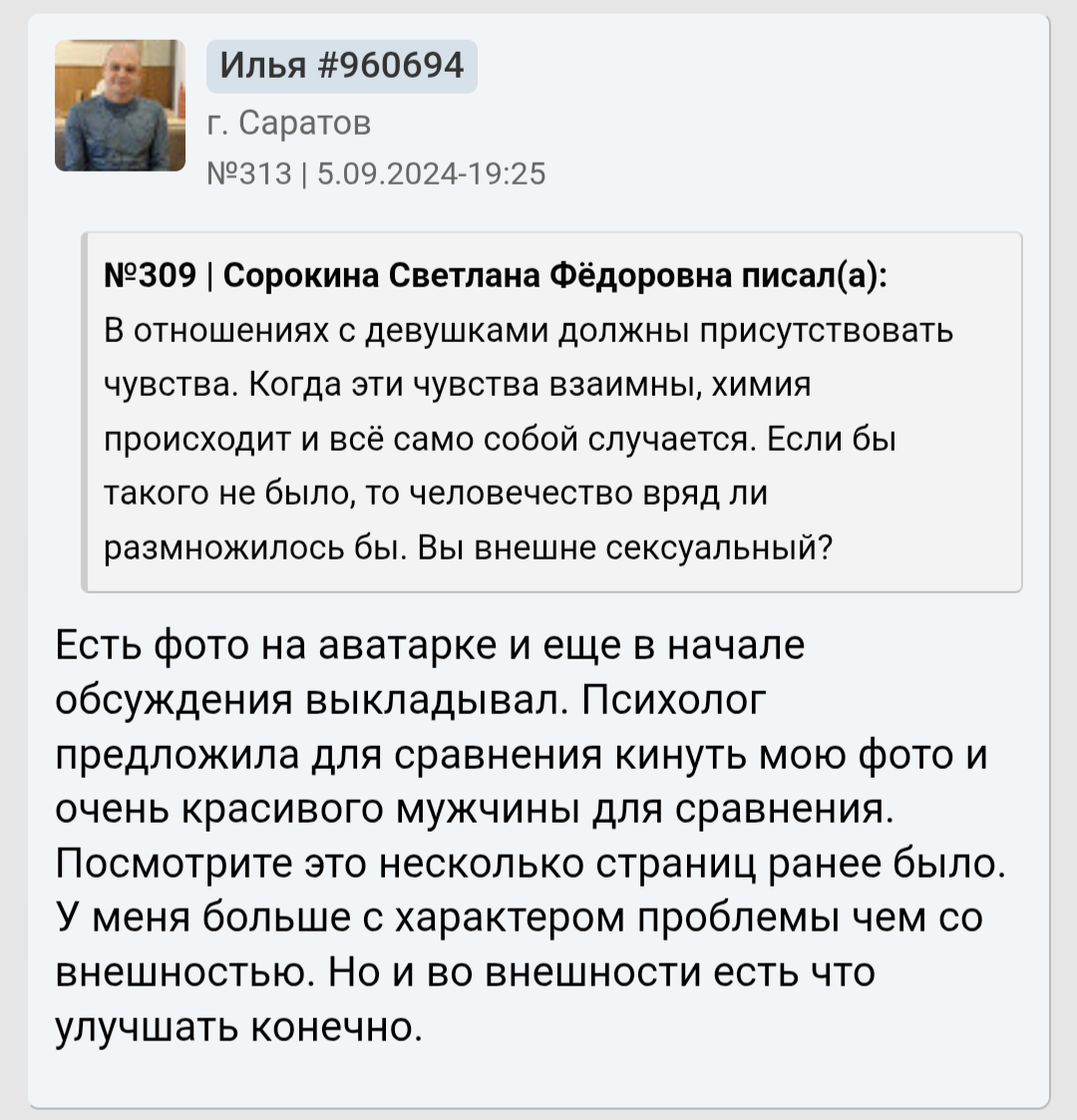 Я классный, по мнению людей со стороны умный и всегда люблю посмеяться. Вот только у меня проблемы со здоровьем которых не скрыть, да и не вижу смысла скрывать перед кем либо так как этого не поправить и это не временно, а навсегда со мной. Тут и скрывается причина почему я остаюсь инцелом и скорее им и останусь до конца своего физического существования так сказать.