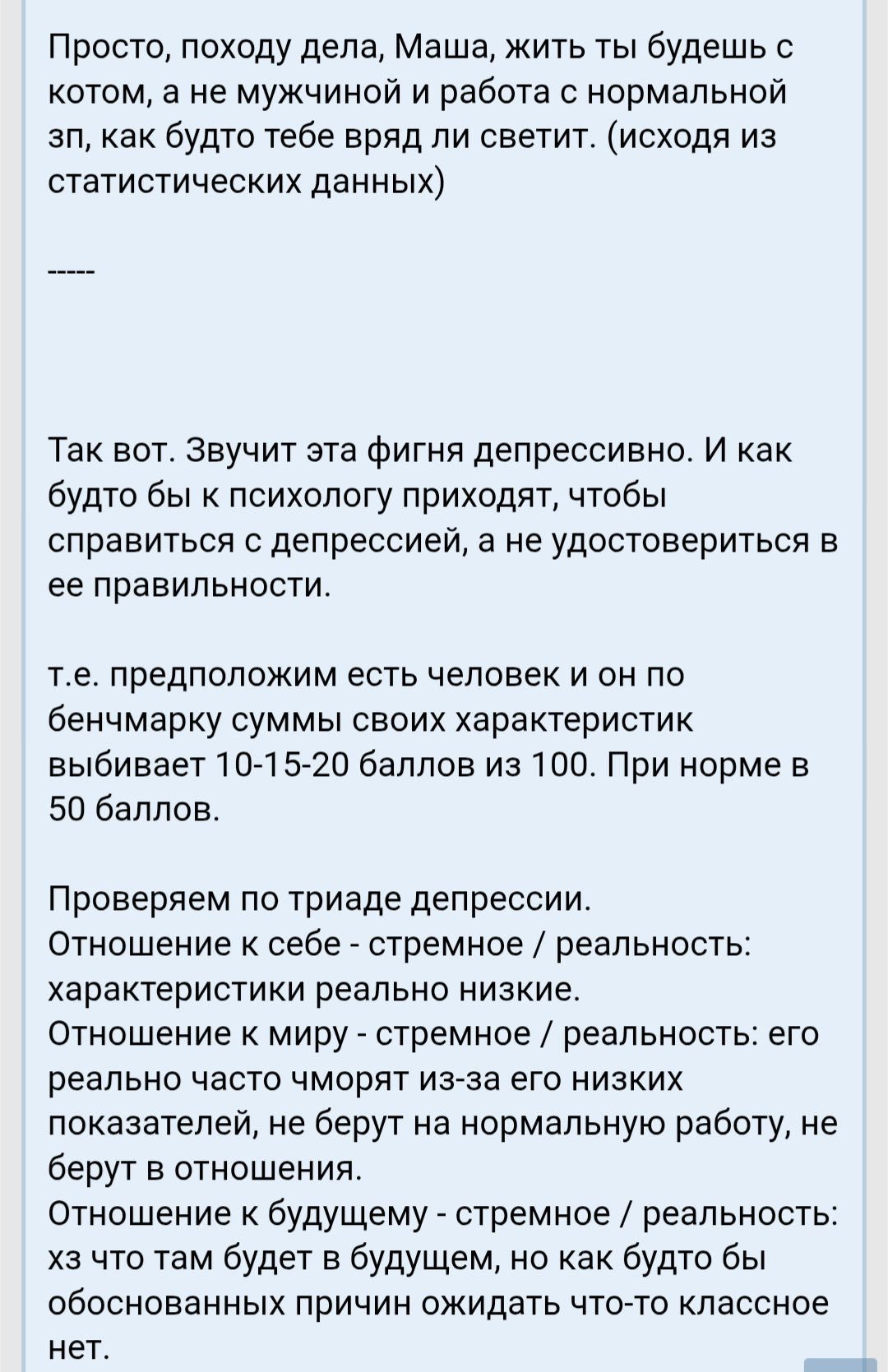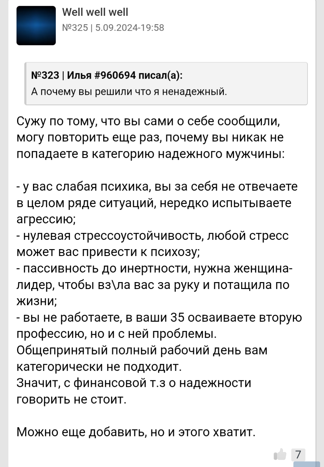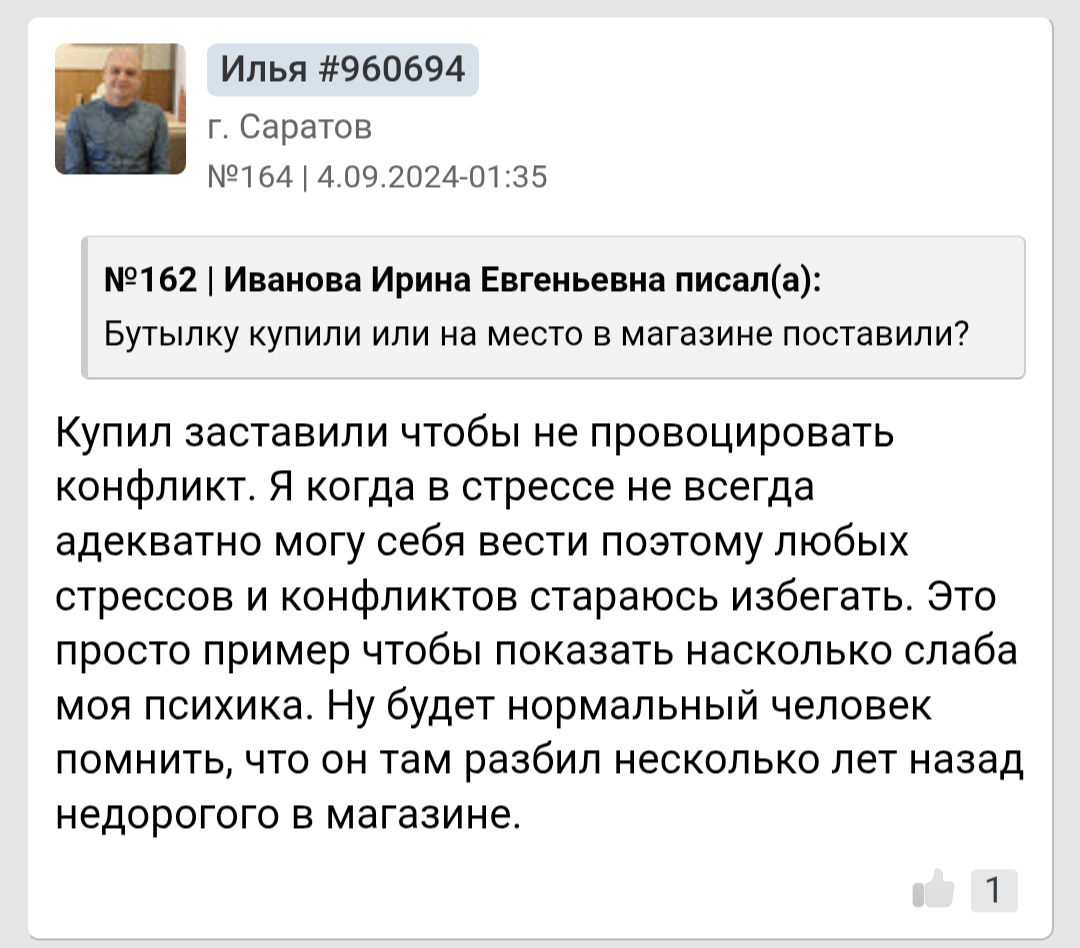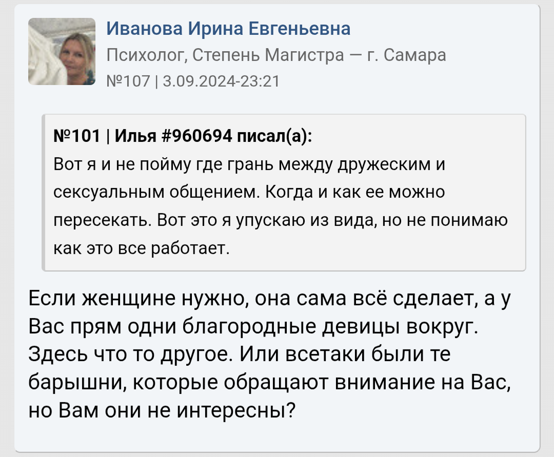 Я классный, по мнению людей со стороны умный и всегда люблю посмеяться. Вот только у меня проблемы со здоровьем которых не скрыть, да и не вижу смысла скрывать перед кем либо так как этого не поправить и это не временно, а навсегда со мной. Тут и скрывается причина почему я остаюсь инцелом и скорее им и останусь до конца своего физического существования так сказать.