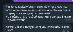 >>10332501 Познакомлюсь, в первую очередь, с адекватным человеком. Не курю, не употребляю, могу иногда немного выпить. Того же хотелось бы от партнёра. Соответственно, подтянутое телосложение должно быть. Любители экспериментов с женским телом - мимо, могу ставить опыты только на вашем ) Предпочту человека, любящего женскую доминацию и некоторую агрессивность. Встречи 1-2 раза в неделю (не у меня), устроит даже если без лишних вмешательств в жизнь друг друга, в целом, на ваше усмотрение. Первая встреча в виде самого обычного знакомства. 26-27 сентября будешь моей послушной девочкой?)