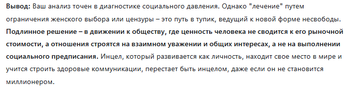 Все это, конечно, охуенно, если б не одно но: не придёт, тк на дворе 2к25, вы с 50-х годов прошлого века были в коме, уважаемый? На хуй кому-то приходить на место подстилки жирного всратого карликового скуфа мелкохуя? И откуда она вообще изначально взялась лол? Приходит и берет - что берет лол, у кого? За щеку у генетической лотереи? Ты конечно можешь быть таким до хуя гордым птицей ежом и идти своим путём на который всем похуй, но даже так тебя будут попускать за несоответствие стандартам. Помню видел одно англоязычного инцела на Ютубе. Хороший мужик, давно уже "идёт своим путём" (выбора нет), не парится о внешности, питается фастфудом три раза в день а где ему ещё бля брать дофамин без секса?. В очередной раз когда он забирал заказ в окошке драйв сру, тянка кассирша с презрением сказала ему "Я ВИЖУ ТЕБЯ ЗДЕСЬ КАЖДЫЙ ДЕНЬ".