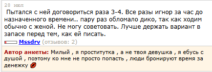 Все, что надо знать о шлюхах: "Идеальный гость это..? Тот который не смог приехать, но все-равно отправил 100к за встречу." с ТГ шлюхи.