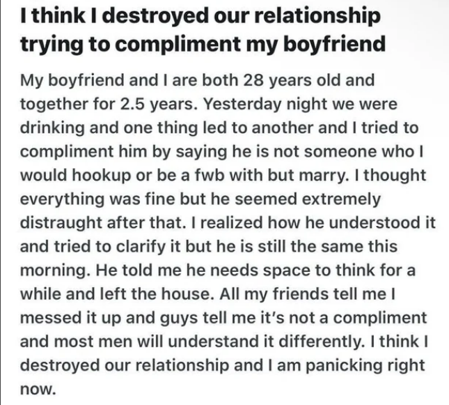случаем не графоманство с реддита, пекабы и прочего? где туповая тня сказала куну буквально что сказала тебе твоя. >he is not someone who i would hookup or be a fwb with but marry >ты не тот которого я бы цепанула или трахальсь по дружбе, но тот за кого вышла бы замуж