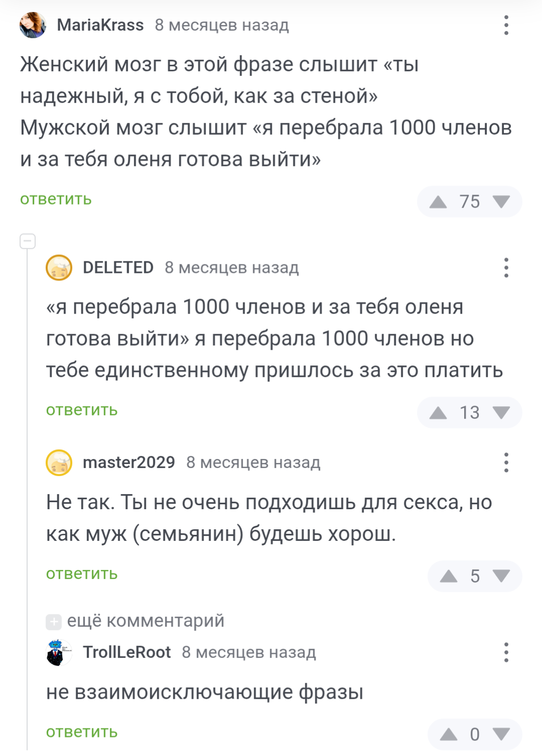 Нет, увы, "моя" девушка оказалась не умнее той бабы. А эту тему я знаю, сам постил скрины ещё весной, когда стал искать подобные ситуации. Прошло уже очень много времени, а мне до сих пор печет от этих слов. Что обидно, что я тогда не спросил, что за хуйню она несёт, а сейчас уже поздно