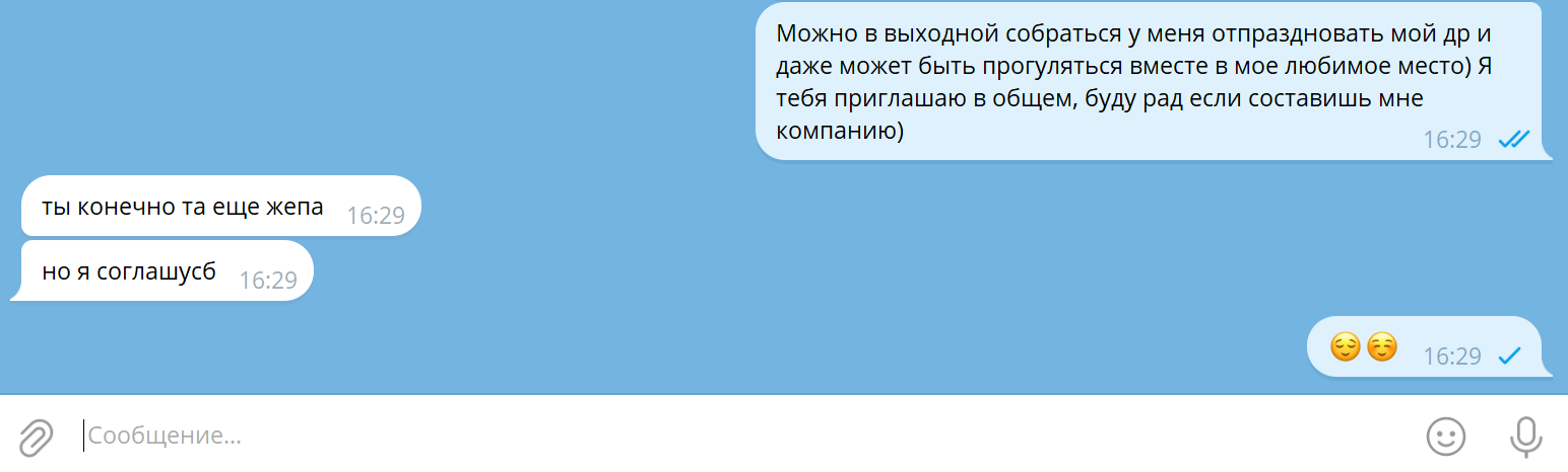 Поэтому я ей прямо всё написал, что мне настопиздило этим заниматься, что ее поведение выглядит так будто у нее кто-то есть или кто-то выебал ее и что у меня больше нет желания навязываться. А я именно что навязывался всё это время. Постоянно сам писал ей, сам тащил на встречи, вплоть до того что прихуячил к ней с цветами рандомно. А в ответ нихуя нет. Она даже не спрашивает как мои блядские дела. Потому что ей поебать на меня. На хуй мне тогда навязываться к ней если ей на меня похуй. Типа я у нее постоянно спрашиваю как она там, как ее работа. Она мне плачется как устала и тд. Я это всё впитываю. Но у меня не интересуется ничем. Я ей в субботу вкинул вброс с фоткой типа интереснейшую историю хочу рассказать ей. Она всё что ответила на это "рассказывай". Я сказал что хочу рассказать вживую. А на фотку спросила типа "что это". Я на отъебись ответил и она больше не спрашивала. То есть я может вообще уже с другой тянкой гуляю. Ее это никак не напрягает, ей поебать совершенно. Я вкидывал что мы типа ни разу ничего не смотрели кроме рика и морти, типа вот надо исправить посмотреть что-то, завтра приеду. А на следующий день "не надо". Мол ей хуево, она рыдала из-за отца с которым у нее не оч отношения и типа она позвонила че-то там высказалась. Убираться ей надо и живот у нее болит. Окей. Это было в обед, приехать я намеревался вечером. Ближе к вечеру пишу типа и в ответ "не надо". То есть тянка дропает меня и вместо того чтобы побыть в моей компании вместе у нее. Она лучше будет одна??? Че блять) Конечно я ей сказал всё что мне это настопиздило и больше не наёбываю ей. Через сутки она скрин кидает какой-то мне чтобы в очередной раз усмехнуться на до мной) И мне тут пишут что у нее интерес ко мне) Угар)