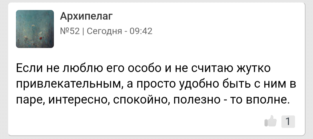 Не, я, конечно, не настаиваю на том, что тебе надо его дропать. В ситуации, когда в стране львиная часть населения - это биомусор/пьянь/солевые/задроты/NEET/неисправимые-бляди-с-хуями-или-пёздами-между-ног/инфантилы/уебаны-по-жизни - то удобнич, с которым ты не бедствуешь, который имитирует неравнодушие и создаёт комфорт и приемлемую психологическую обстановку в доме - это далеко не самый худший вариант. Но мне кажется, что ты сильно идеализируешь и его, и его отношение к тебе.