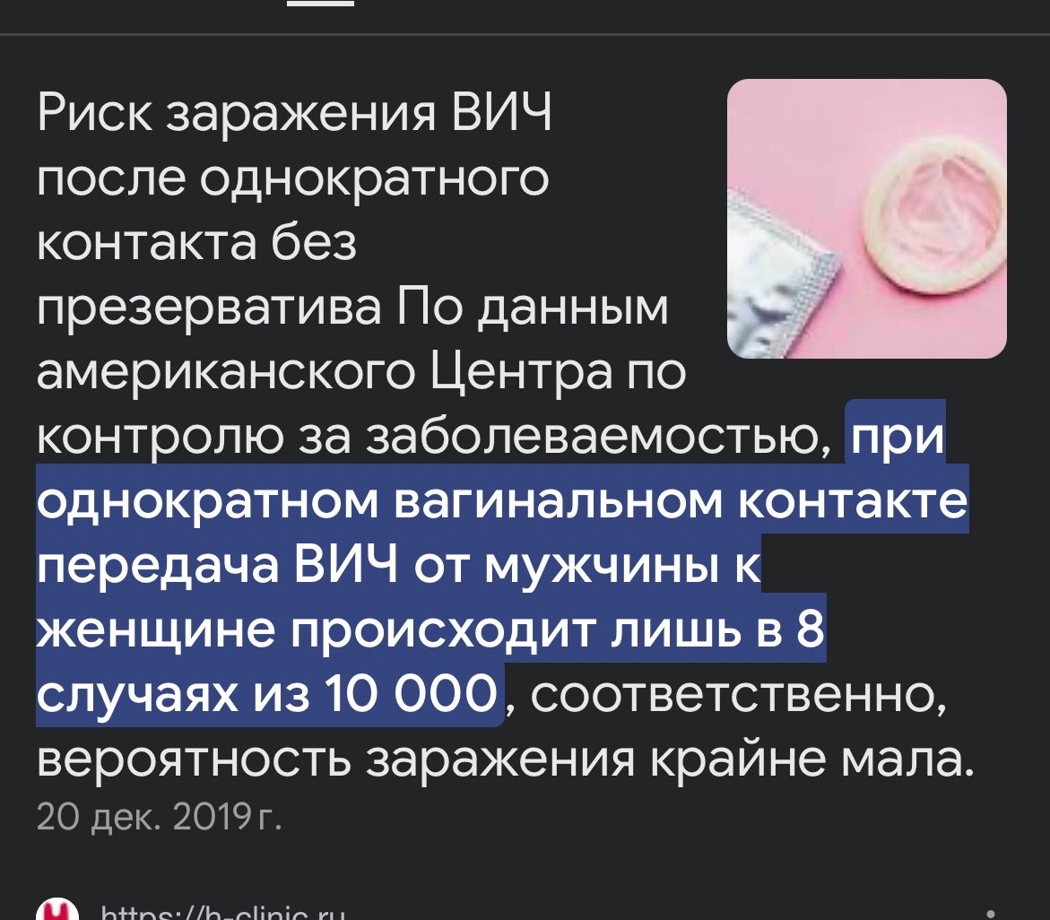 Но также стоит помнить о процедуре ПКП в первые 72 часа после проблемы, которую я будучи трясуном 2 раза проходил. По заверениям медиков, тот шанс 8 на 10000 она умножает на 80% что при прочих переменных уменьшает шансы залететь.