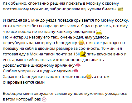 Все, что надо знать о шлюхах: "Идеальный гость это..? Тот который не смог приехать, но все-равно отправил 100к за встречу." с ТГ шлюхи.