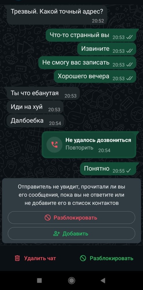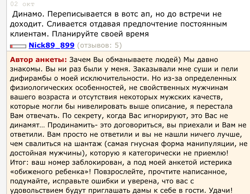Настолько преисполнился, что не смотрел прайс и фотки, тупо кидал всем две фразы - "Встретимся сейчас?" и "Адрес?". Использовал два разных номера. Десяток шлюх сразу кинули в ЧС. Еще несколько кинули в ЧС увидев мои фотки. Дважды выгнали с порога. Несколько раз пытались соскамить на предоплату.