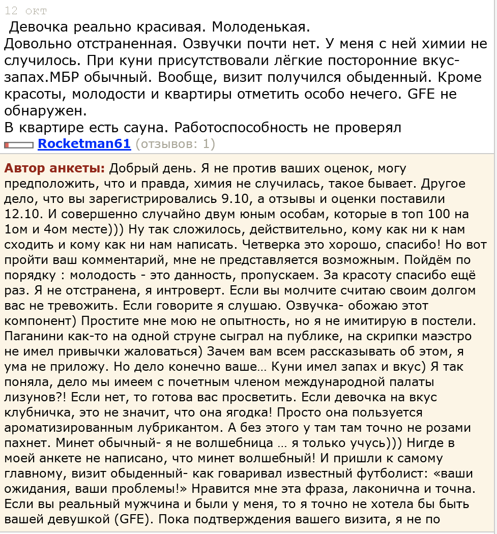>>10390964 Несколько месяцев назад, а лучше весной - было хорошо, да. Сейчас: тело - ок, всё, что пишут про сиськи-жопу - да, так и есть. Но не стоит ожидать хоть какой-то инициативы и заинтересованности, особенно если ты не ультрачед. И посмел явиться без чаевых и цветов. Отношение к ходокам в среднем отражено в её ответах на отзывы. Но как минимум раз среднего анона потерпит.