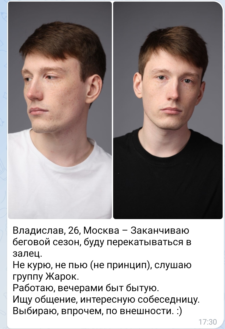 >>10389250 >Подрабатываю официантом, по советам окружающих буду вкатываться в модельную сферу. Без вредных привычек. Рэп не слушаю. Ищу спасение от одиночества...