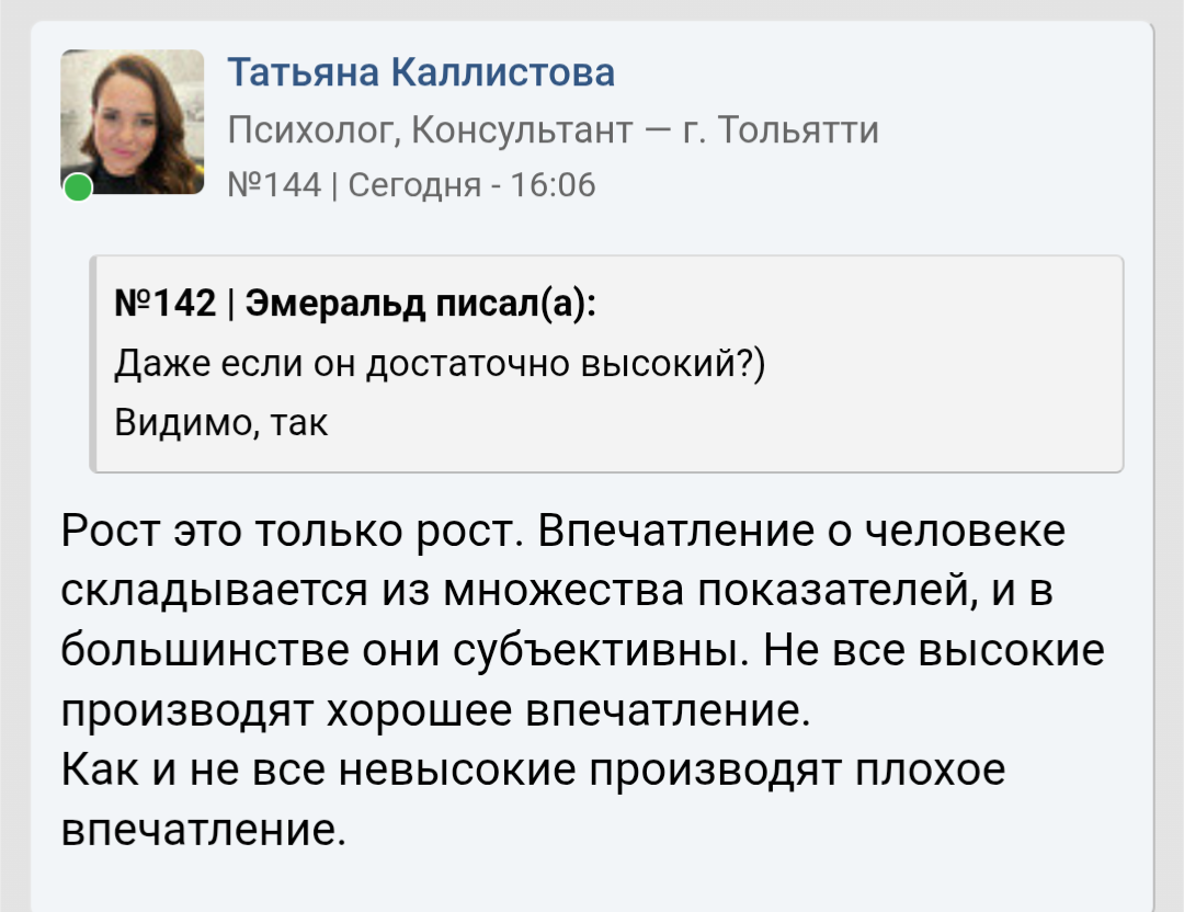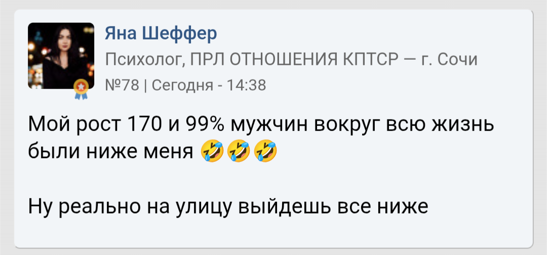 >>10392607 >Тут дело скорее в выученной беспомощности + понимании, что рост тупо мешает комфортному существованию, даже не в отсутствии привлекательности для противоположного пола. Понял тебя, у меня тоже были диалоги с тян с СЗ несколько лет назад , с одной жирухой я даже на тему секса переписывался, но потом все стухло. 171 см