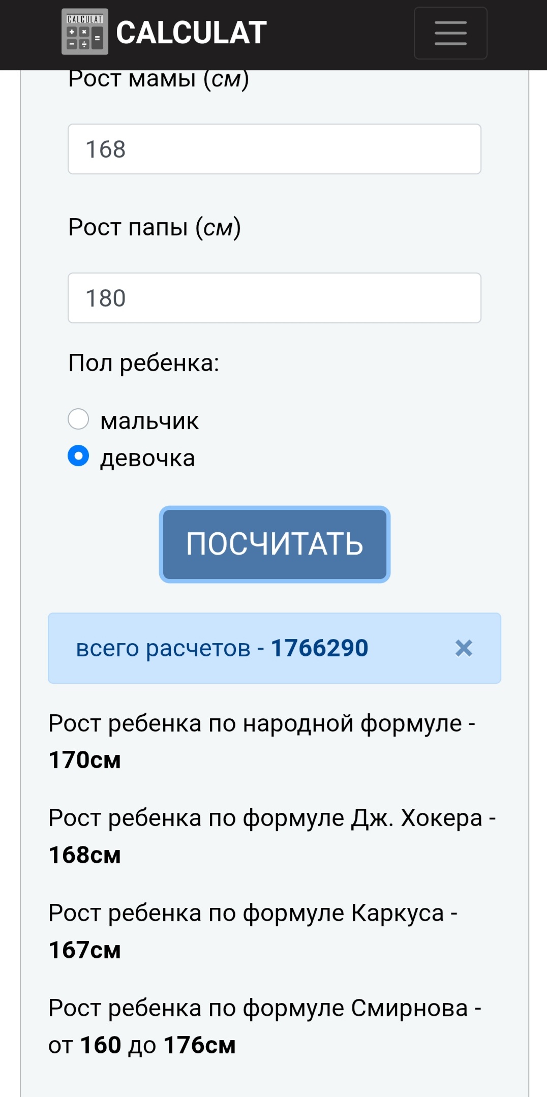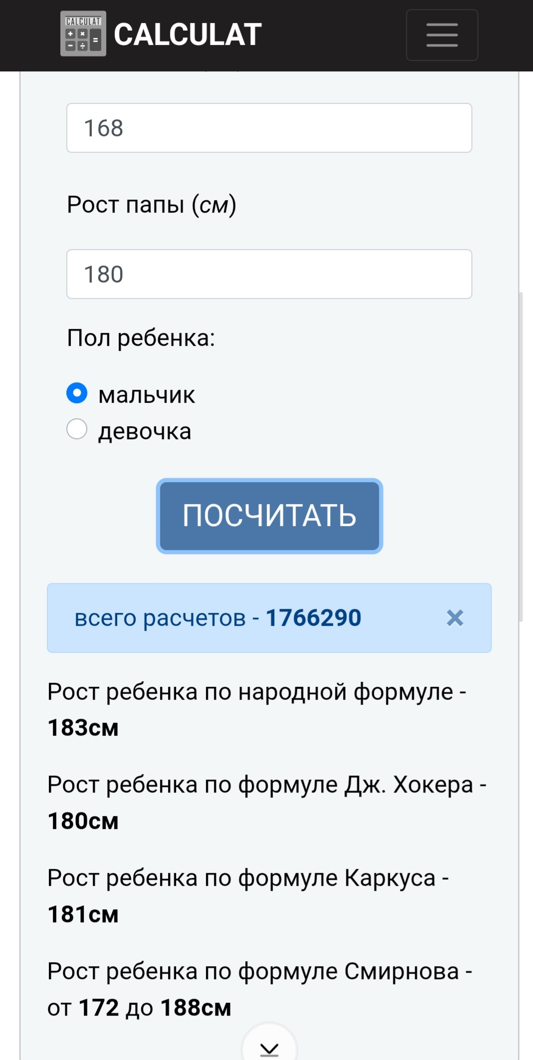 >>10445329 Гляди, чего есть. Если по последней формуле смотреть, то все в норме. А вот если бы ты был девочкой, тогда так. у меня все наоборот, по расчетам для женщин я должна была быть полторашкой, но я почти добрала мужскую норму. При том, что в 90-е жратва была небогатая. Какой вывод? Либо формулы хуета, либо нам с тобой надо менять пол. Выбирай, что больше нравится.