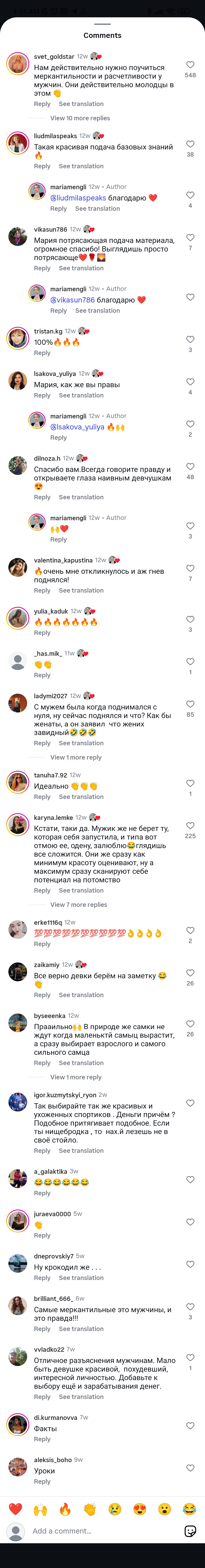 >>10417968 Слушай, я не знаю статистики, я тебе говорю то что вижу. Бьюти-бизнес позволяет буквально каждой иметь стабильный высокий доход. И это происходит не первый, не второй, и даже пятый год. Потом кроме бьюти, тянки вполне себе работают работы. >>10418057 То есть ты судишь о равном партнёрстве по рилсу? Она может после этого кокоса пошла и оплатила следующие путевки в другое место, или может они живут в ее новенькой квартире, где она даже за коммуналку с него может не брать, потому что и так в достатке, при этом она может быть спокойна и не заморачиваться, потому что от него и так полно инициатив, в свою очередь и он на расслабоне, сегодня она ему кокос на камеру дарит, завтра «милый, вот тебе айфон в подарок» >>10418074 Я не понимаю почему тебя так напрягают люди из инсты? Неужели ты буквально воспринимаешь все эти рилсы? Не исключаю, и такие кадры есть, но в большинстве своём это обычные тянки, которые для инсты играют определенный образ.