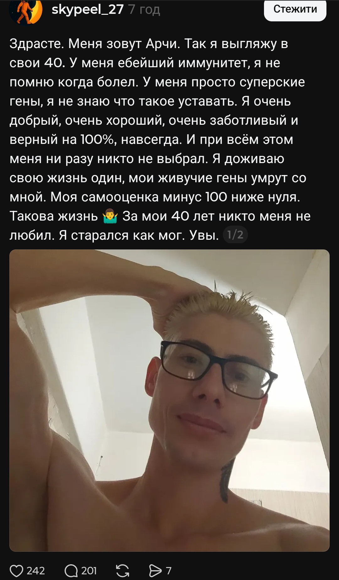 Мужику 42 года, большую часть жизни был алкоголиком. Юность припала на 90е-2000е года. Рост 172. Тянок дохуя было у него по молодости. Вот что значит жить до эпохи сз и массового интернета.