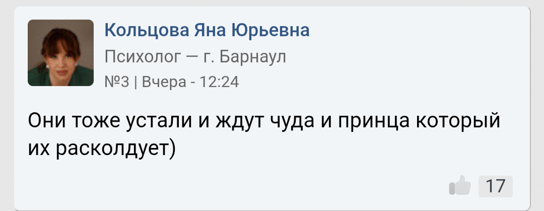 Спросите у успешных красивых женщин, сколько они тратят на уход в месяц))) Иногда это будет больше вашей зп, не обижайтесь, что женщины, которые выглядят охуенно, просят у партнера достойную сумму заработка. Потому что, скорее всего, они и сами классно заработают 🤷♀️ Потому что такие женщины хотят, чтобы их уровень жизни смогли потянуть. Если ей хватает на самолет первого класса, а ему не плацкарт и палатки, хотелось бы знать это на берегу. Они не просят, но кому хочется снижать свой уровень жизни, если партнер его не тянет."