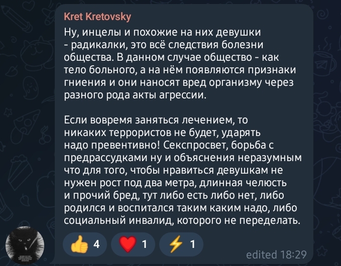 Олдфаг инцел тредов здесь. Сижу в них с 2017 когда они ещё были листва тредам, когда здесь создали картинку с бабкиным на фоне порша панамеры и когда создавали репортажи на канале ЛИСТВА 24