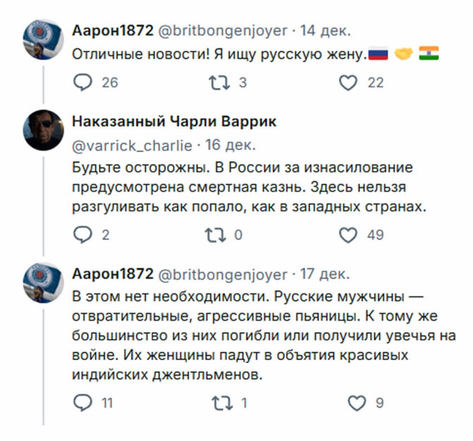 Теперь попробуй представь, что, например, вот есть какая-то р. тня. К ней подходит, скажем, специалист и спрашивает, можно ли познакомиться. А рядом стоит её брат-русачок и говорит, что он запрещает ей это делать, что он против. Это физически невозможно в Педерации, любая натрашка просто со смеху лопнет, если ей такое её брат скажет. Вот такой здесь патриархат, по мнению дебила-полиамора.